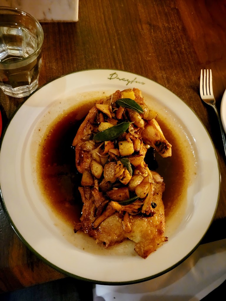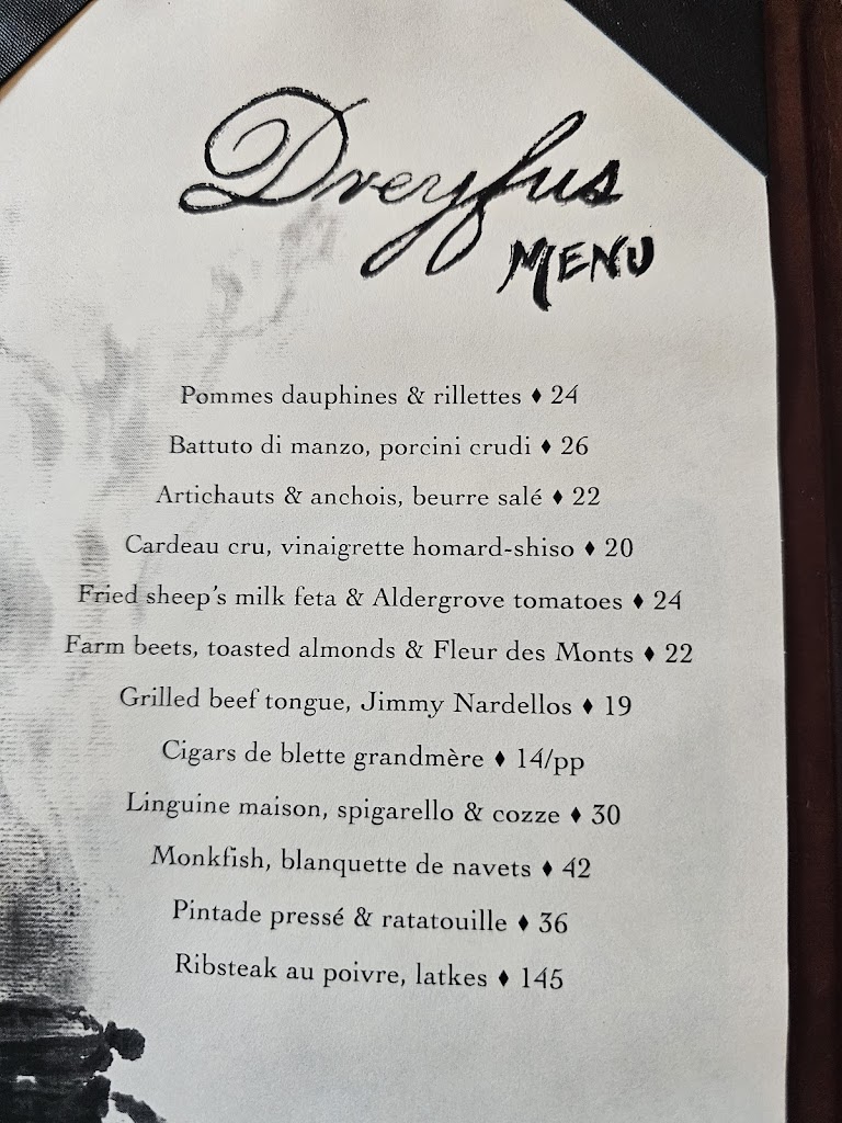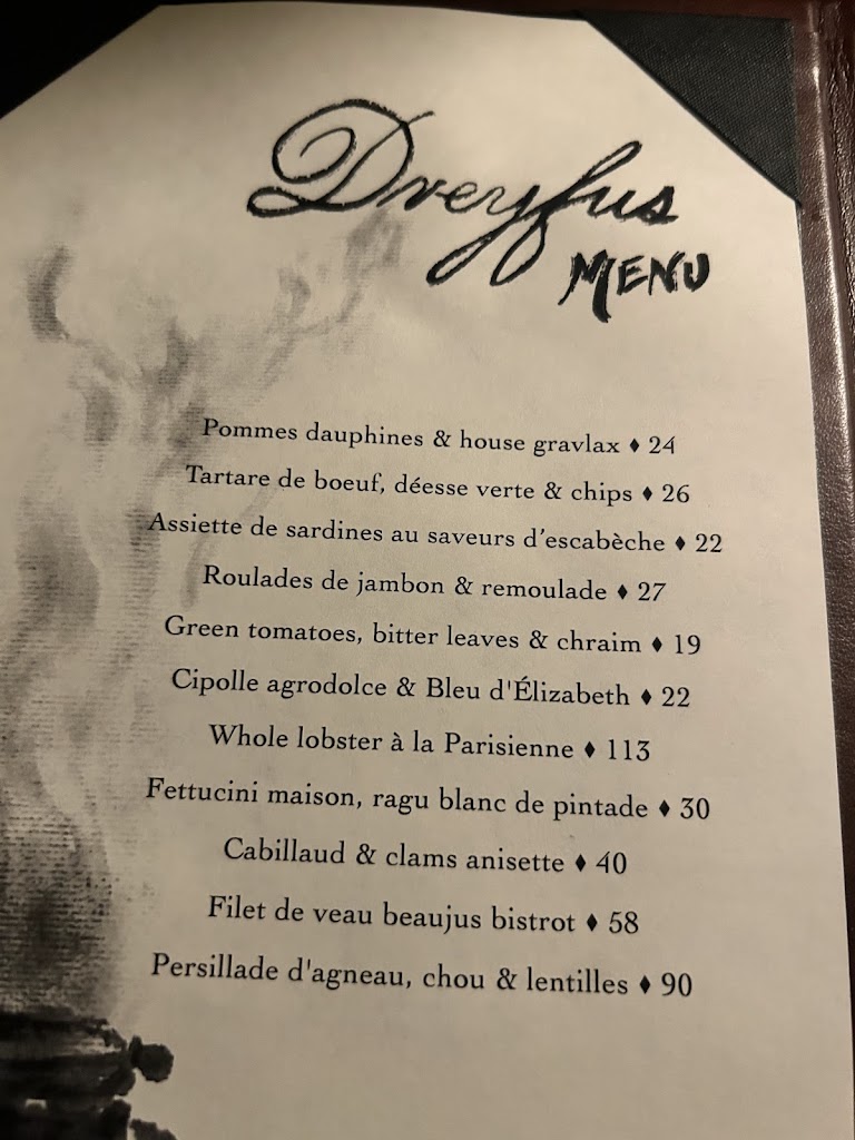 In a sea of carbon-copy fusion spots, Dreyfus offers a refreshingly distinct atmosphere. The food was amazing (tartare was a highlight, Id probably serve a 10-year sentence in exchange for the lamb ragu, and Id betray my closest friends for another bite of the cheesecake). The menu is entirely in French, which left my girlfriend and me in an initial panic, wondering how we could slip out our phones and Google translate each dish under the table, but in a ~chic~ sort of way. Thankfully, the staff is really lovely and walks you through the menu, dish by dish, as well as the cocktails. Both change regularly, between the food and drink menus, which is fun. The space itself is quite warm. The tables sit close enough together to feel intimate, while the surrounding chatter lets your conversation feel private (as Jordan Baker notes in Gatsby: I like large parties. Theyre so intimate. At small parties there isnt any privacy.). Thats how Dreyfus feels; lively yet tête-à-tête, as the waitstaff might say. The service itself was lovely: attentive but not overbearing. To those noting they felt rushed, maybe you were just a bit of a bore. Or you didnt get dressed to go out. Or maybe you were rushed. Hey, I dont know your story. Either way, for fantastic French cuisine, great service, and a distinct atmosphere, look no further.