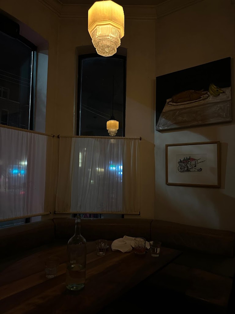 Food was delicious but cocktails were weak and unfortunately we had to remind the server about the $85 bottle of wine we had ordered. The appetizers were all potato based, except for the one that was sold out and no alternative added, they also came out within minutes of ordering making the start of our meal feel very rushed. While it s not a terrible experience I don t think the prices are good value for what we received. The server did try to make up for their forgetfulness with a bit of digestif at the end but it s personally not my thing. Atmosphere was lower due to how close the seats are, we were beside the larger table so had people squeezing past us multiple times to get in and out which was a bit uncomfortable, also could barely see inside since we were right beside the door but that happens