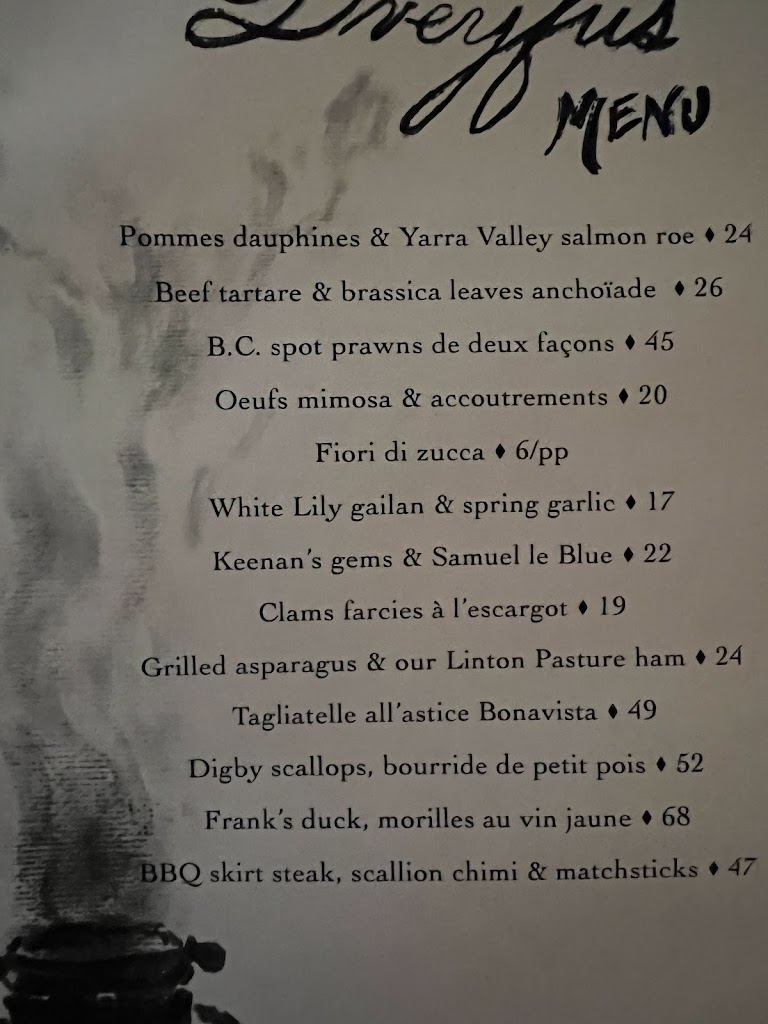 This was very eagerly anticipated having heard amazing things about Dreyfus! The positives: The food was VERY good. We had everything on the menu except a couple of dishes and everything we had was excellent. The veal, duck and the dauphine potatoes were particular stand outs. The food is 100% worth the hype. The negatives: the drinks menu was a frustration. The menu gives very little away about what the drink actually is (e.g. name of wine but no mention of the grape etc.). Same with the cocktails - just a name with no description of ingredients. This felt quite pretentious and unnecessarily confusing. Because of this, our food was on the table before we had ordered any drinks as we had to wait for the server to talk through different options. I also felt the server didn t really inform us accurately about the drinks we did end up ordering. Feels like a pretty easy fix..just provided a little more detail on the menu. One other minor gripe, the cost for the portions is very high. The lobster dish in particular was tiny and cost upwards of 30 dollars. However, this is fairly standard in higher end places in Toronto. Overall a good night with amazing food, ever so slightly let down by drinks and service but good nonetheless!