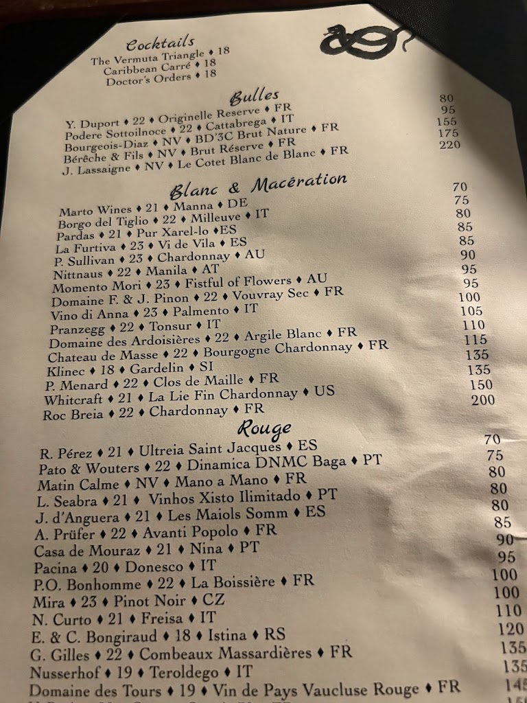 Small but well-designed menu. A little too precious and while we did not expect large portions we did not expect to be somewhat hungry after $200pp. Will spend our money down at one of the other neighborhood restaurants next time.
