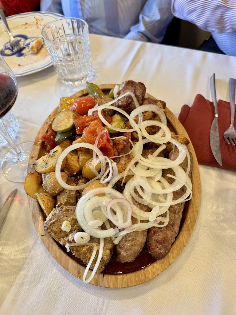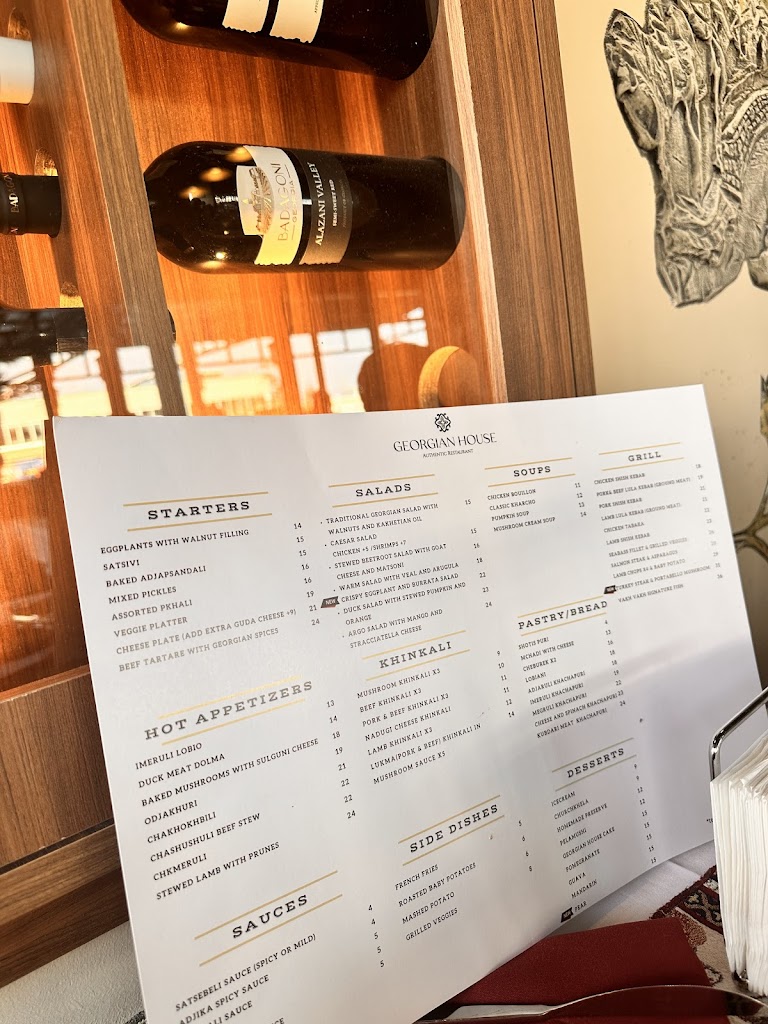 My partner and I went to Georgian House for a date night with good food. It was my first time there, and the atmosphere was amazing, with live singing that added to the experience. I also enjoyed the design of the space. We ordered a bottle of wine, which was, as always, good and never disappoints. For food, we shared a cheese pie, which was delicious. I ordered baby potatoes and grilled vegetables as my sides, while my partner chose the chicken shish kebab. My meal was fantastic, though my partner thought the chicken could have been better. I also got two sauces; I didn t care for the adjika as it lacked flavor for me, but I really enjoyed the spicy Satsebeli. The service, however, was a bit disappointing, with not enough attention to detail. For instance, my vegetables were served alongside my partner s meat dish. As a vegetarian, I prefer not to have my food touch meat. Additionally, our wine was served while I was in the washroom. There were a few more small details that could have been better. Overall, I had a nice meal and some yummy wine to enjoy by the end of the night.