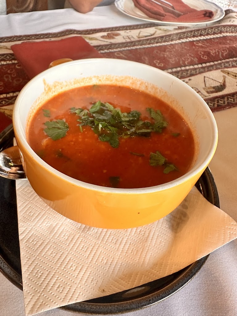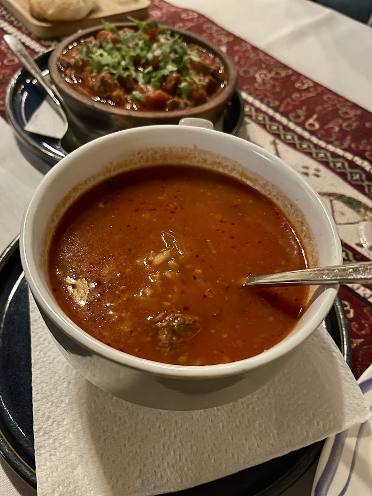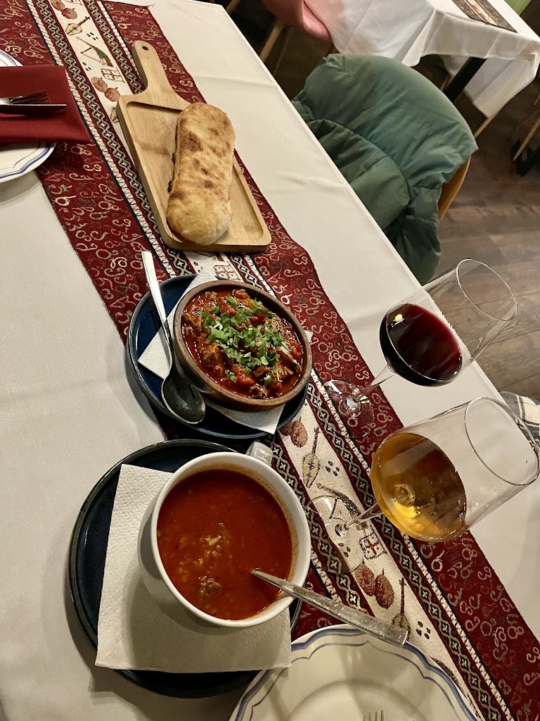 The food and the vibes of this place are just amazing! Delicious and tasty authentic Georgian food, great service and what a welcoming atmosphere.. They have live classic music some days and the whole place is so colorful and full of life. A Georgian friend of mine always takes me there, and it’s always a great experience for me. This time we were celebrating her promotion and we ordered a special sized Atcharuli khatchapuri.. and wow!! What a yummy dish.. So much cheese with a very soft bread and eggs.. You can see in the pics.. Really something you have to try.. She also ordered us Lobio qotanshi, super flavorful beans that were mouth watering.. My favorite has always been Khartcho, traditional Georgian soup with beef. I always have to order it. It’s a good portion but not so big so you can still try other things, like their Khinkali that are Georgian dumplings.. I recommend it. Delicious! I’ll definitely come back and I’m falling in love with the Georgian culinary. Place always with beautiful people and great Georgian wine. The whole experience makes you feel like you’re in a little Georgian land in Canada. Highly recommend it. Thank you guys for always welcoming us warmly and take good care of us.