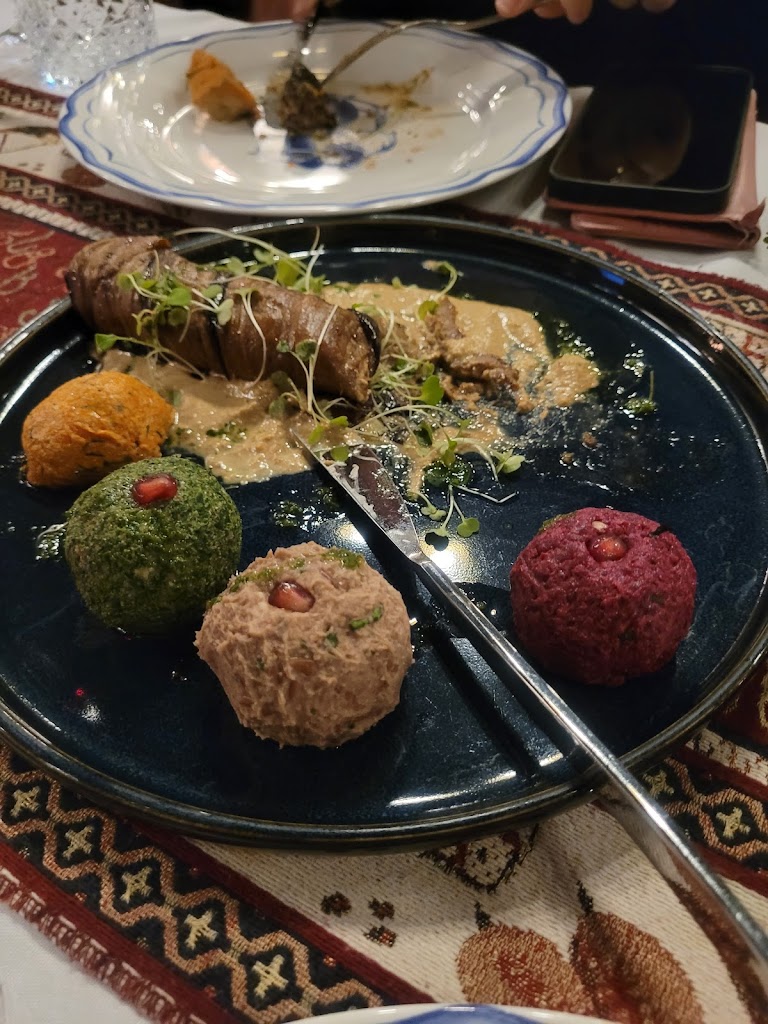 Authentic Georgian restaurant hidden in an unexpected location and beautifully decorated..however… The service was not good. George, I believe his name was our server. Took him 25 minutes to just come over and take the order and once he did, he was not paying attention to allergies and requests. The place is beautifully decorated . It’s modern and airy, cosy with beautiful Georgian atmosphere. The overall quality of the food was excellent but most dishes were spicy, even though we asked several times prior to ordering. For example we ordered the beet/goat salad and would never imagine it would be so spicy. The live music in the background was beautiful, but extremely loud and we could not hear each other speaking to people across the table or even just beside us and it felt more like a loud wedding. I would highly recommend they lower the volume, so people can actually have a conversation while enjoying their food as it was extremely loud. They never came to check on our food if there’s anything else we needed. Their servers need to be more attentive and know the menu better and especially in inform their customers which dishes are spicy and respect allergies.