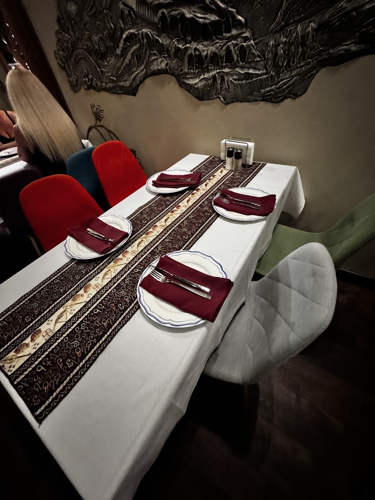 Found this newly opened Georgian food restaurant on recommendations. Place is good, designed authentically. Food were pretty normal The only thing has to be worked on is rude communication with guest. Starting with no hi-hello on phone, no hi-hello upon arrival and finishing with how stupid we are that we asked for sauce to khinkali If you think something is wrong in the way we eat your food then try to explain instead of laughing in our faces If I want to eat Georgian food later I don t think I want to go through it once again Vegetarian options: Eggplant roll, mushroom khinkali, Khachapuri, mushroom and cheese Dietary restrictions: Eggplant roll Parking: Outside of the restaurant