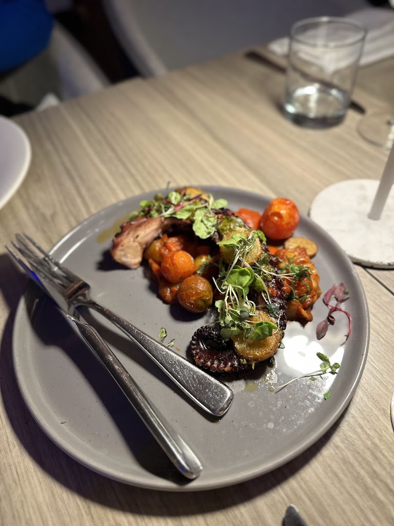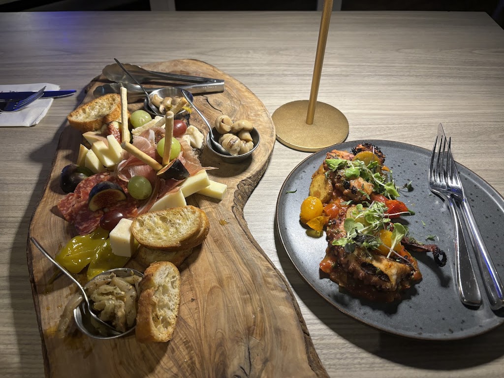 We came before our show for some apps - we ordered a half dozen west coast oysters (we were given option of east or west coast. The oysters were cleaned and shucked well, no shell pieces at all), the octopus (not chewy, the tomato based sauce paired well with the octupus) and the charcuterie board (the baguette was overly crispy which made it flavourless and ended up cutting our upper palate from chewing it! They also tasted a tad stale? We found the breadsticks also tasted a bit stale. The meats were thinly sliced and the cheese options balanced the sharper tones of the meats. I wouldve preferred a bit more fruits on the platter). We also ordered the cheesecake wrapped in phyllo crust - this was delicious and warm, though a very small portion. Prices are on the high end for portion size.