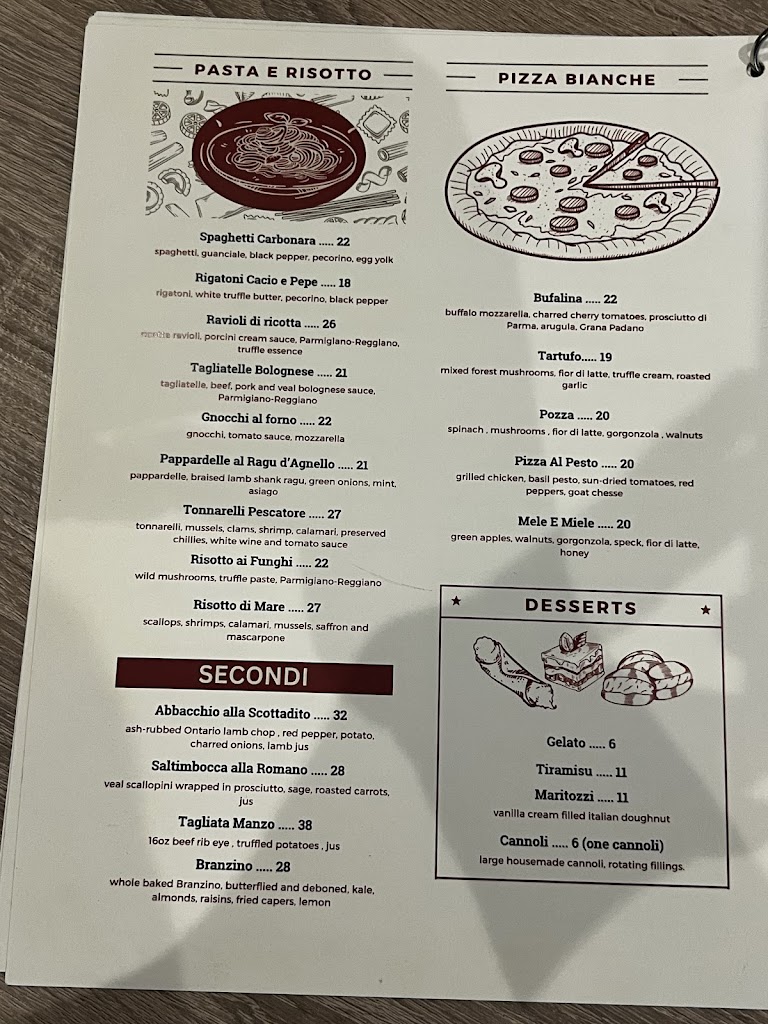 A bit of a Jekyll and Hyde situation here, so I struggle on the star rating. Ill start with the good - came here several times for their pizza lunch special, and it was incredible, and a crazy good deal at $15 (that deal is no longer offered, but they do offer inexpensive lunch-sized pizzas). Their pizza was absolutely delicious - light, airy crust, and fresh ingredients. Actually, it was one of the best Ive had in the city. Their Caesar was also good, and the cherry canoli was amazing! As for the bad - we decided to try them for dinner last night, and oh my, what a disaster! The mussels, in a tomato sauce that was far too thick and the flavour far too concentrated, were dry and fishy. The sauce tasted like a can of tomato paste. The pastas were a complete fail. I had the so-called Cacio e Pepe, which bore absolutely no resemblance whatsoever to authentic Cacio e Pepe pasta. It was basically a plate of spaghetti (cooked in what must have been unsalted water, because it was tasteless), swimming in a bowl of milky brown truffle sauce with the slightest sprinkling of parmesan on top. The dish was totally tasteless (could not discern any salt or other seasoning at all), and all you could taste was the truffle oil/paste of the soupy goopy mess of white sauce. My partner had the Papardelli ragout, which also had zero flavour, and the sauce was the furthest thing from a proper lamb ragout weve ever had. On a positive note, one friend had the lamb, which, while not exactly a beautiful presentation, tasted quite delicious. By all means, try their pizzas (assuming its the same chef that used to make them), but as for the pastas and mussels, give them a wide pass! So disappointing for a place that had so much promise to boost the neighbourhood with a cute little Italian café. Fingers crossed theyll take the (several) terrible reviews of their pasta to heart and work on making a proper italian pasta! Service was extremely pleasant and the very affordable wines were well-chosen and reasonably priced. I wish I could say Ill give them another try, but alas, with a meal that bad, I cant go back.