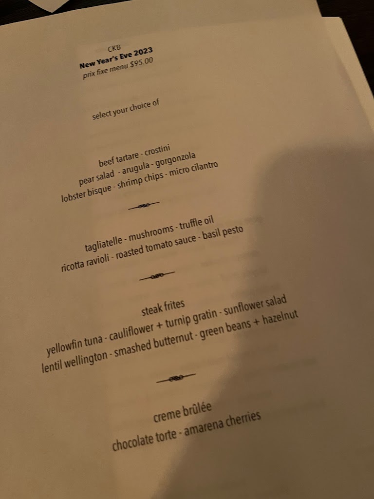 Came here for New Year’s Eve prix fixe dinner. Overall, it was a good experience. The staff are very friendly. The food was a bit inconsistent though. The lobster bisque tasted good, but was not visually appealing. The tagliatelle was lacking in taste, but the pasta noodle itself was good. The steak frites was the best I’ve had. The chocolate torte with cherries was missing the cherries, so the torte alone was bland. I think they ran out of cherries.