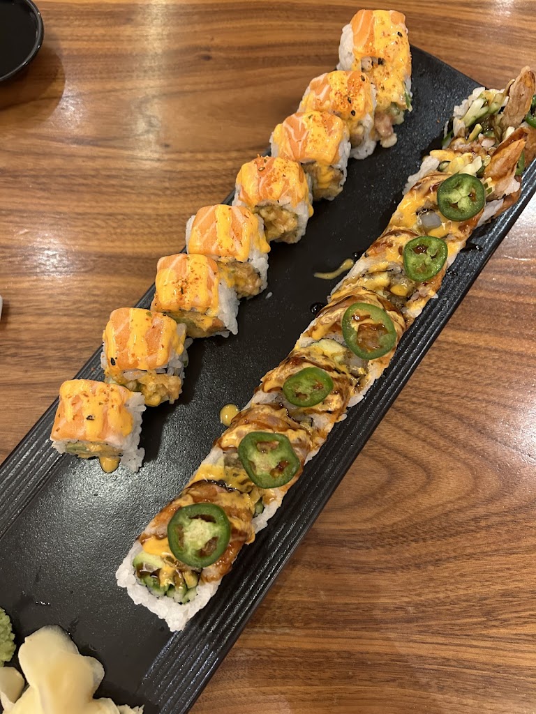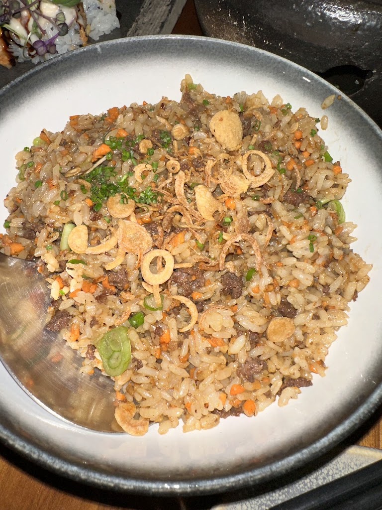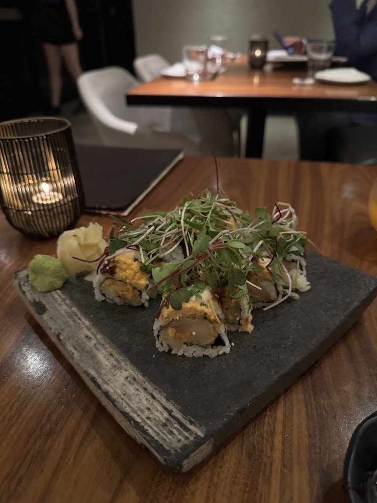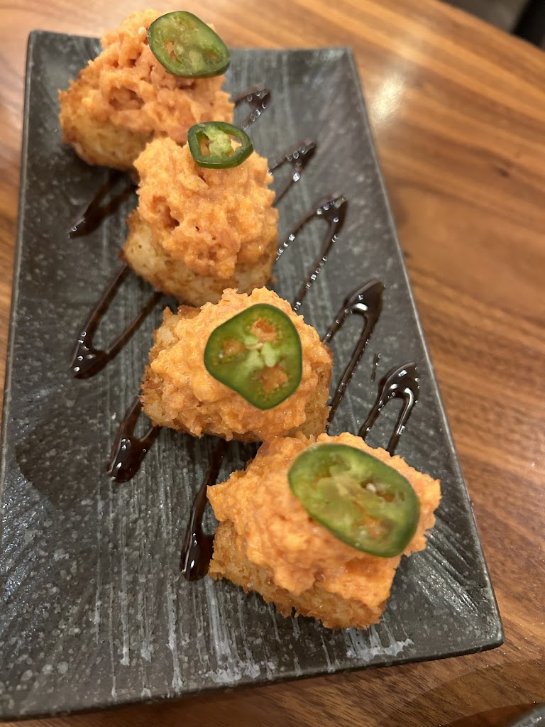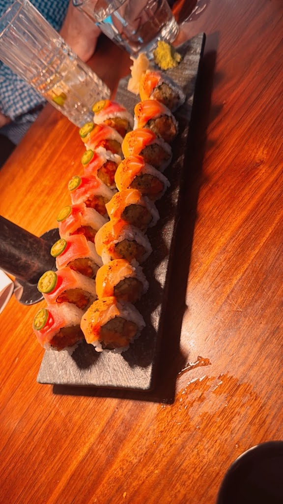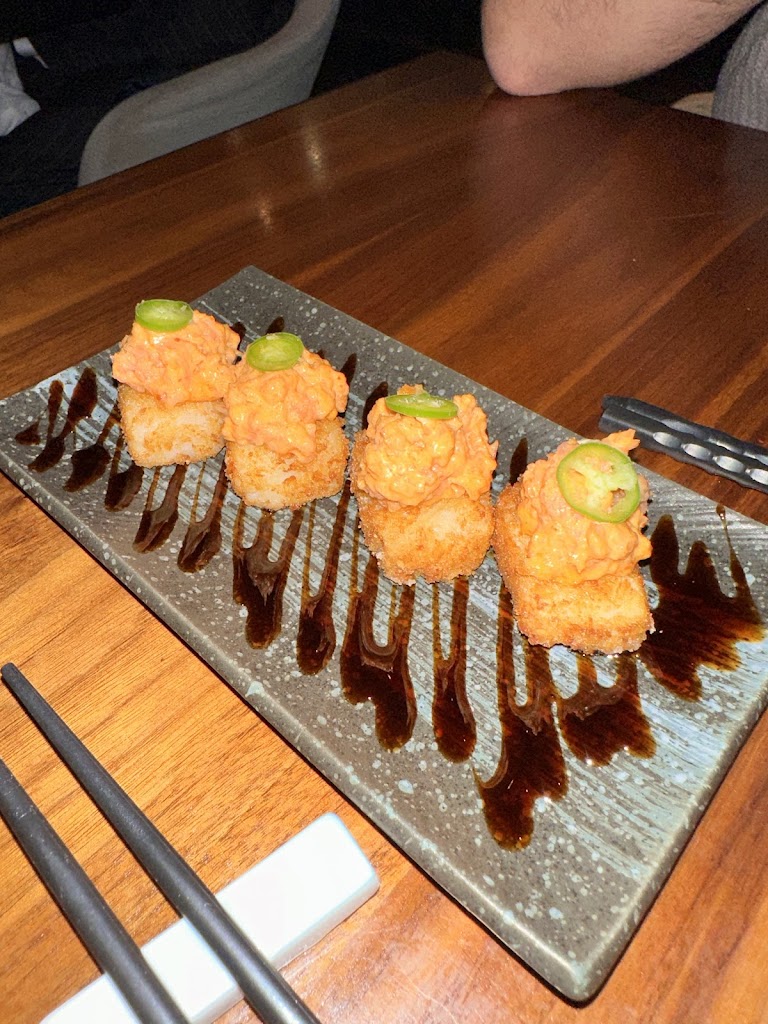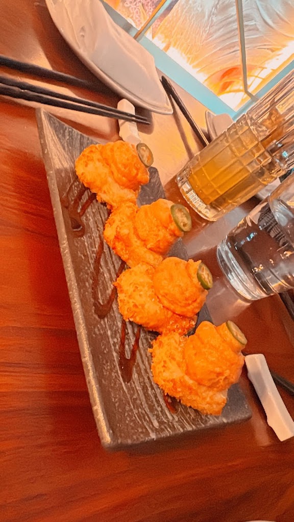 Dark ambiance, but it’s a nice atmosphere for dining. Service is kind and hospitable. Spicy shrimp maki roll is recommended, it has a nice flavor, though not overly spicy. Spicy salmon was also good but missing a kick. Crispy tuna rice was a bit bland but a creative dish. Wagyu bao bun is highly recommended, the beef was very delicious.