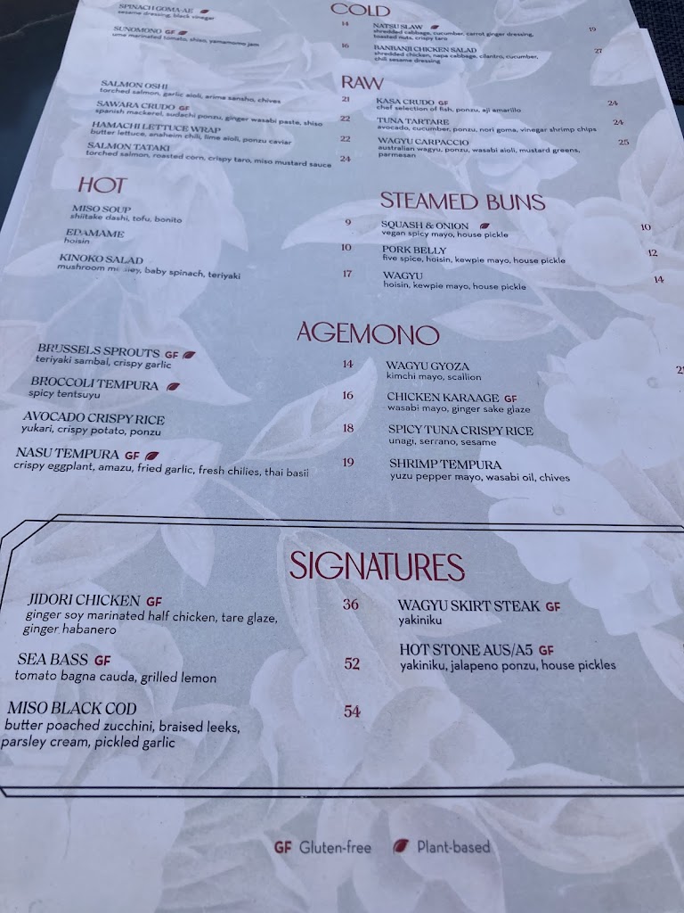 Delicious options! The service was great and extremely friendly! Every interaction was met with a smile, and the other servers were also very helpful when I was walking around the restaurant, trying to find a place to take a photo! What a great experience and a great way to celebrate my birthday! Ordered: SPICY TUNA CRISPY RICE 10/10 WAGYU BAO 9/10 WAGYU SKIRT STEAK 10/10 WAGYU RICE 10/10 KASA MOTO ROLL 10/10