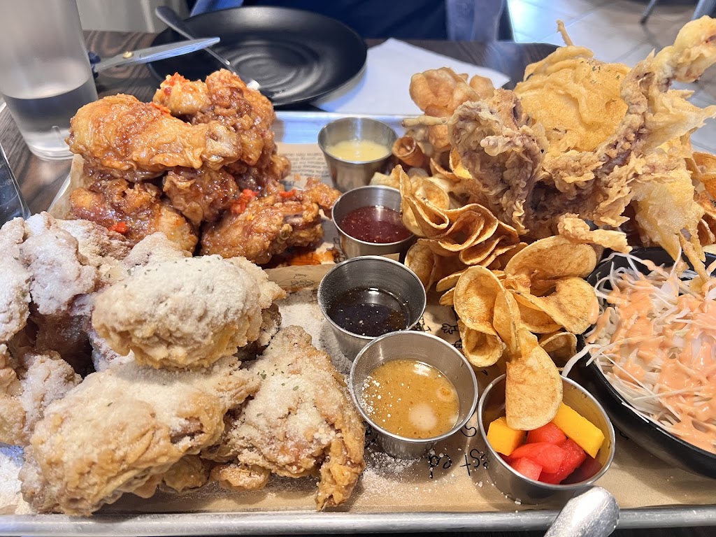 I recently had dinner at Sarang Kitchen with a group of friends, and we all had a great time! The food was delicious, the service was friendly, and the atmosphere was lively. We started off with the Sarang platter, which was a great way to try a variety of different dishes. The platter included a variety of appetizers, such as pickled radish, cabbage coleslaw, tornado-cut chips, whole crispy squid , 2 flavours of Korean fried chicken and 4 dipping sauces. Everything was fresh and flavorful. The highlight of the platter were the fried chicken, the exterior was fried to be perfectly crispy while maintaining a juicy and tender interior. The batter is seasoned to perfection, offering a satisfying blend of savory and slightly sweet notes and we appreciated that the wings had customizable spice levels. The variety of dipping sauces that complement the crispy chicken beautifully, adding an extra layer of flavour and texture. We also ordered the spicy rice cake, which I found a little sweeter than Id prefer but was loaded with plenty of rice cakes, fish cakes, veggies, eggs and ramen. Having makgoelli and soju were the perfect accompaniments. The service at Sarang Kitchen was also excellent. Our server was attentive and friendly, and he was able to answer all of our questions about the menu. Overall, we had a great experience at Sarang Kitchen, and I would definitely recommend it to anyone looking for a fun and delicious night out with friends. This place is also great for those who need a quiet and calm dining experience as they offer a sensory room, sensory boxes, dimmed lighting and calming music.