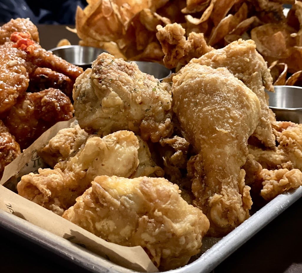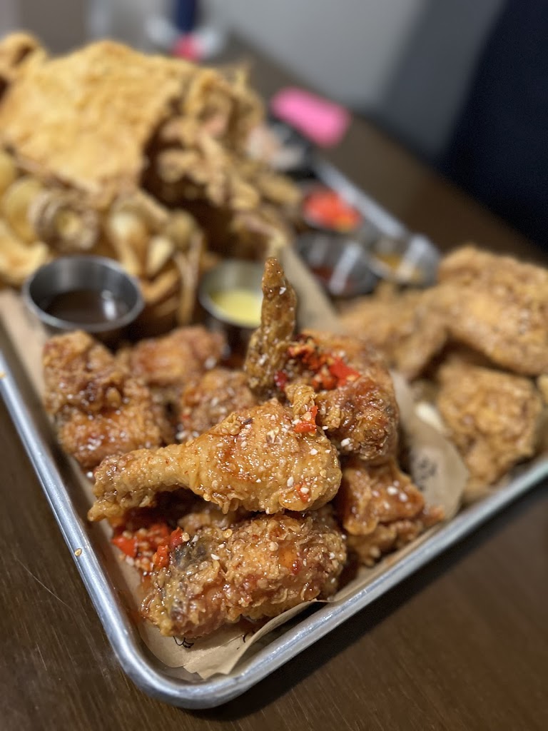 Excellent Korean fried chicken! Spicy is VERY spicy, fair warning. The mushroom fries are a great appetizer. Portions are also large, I couldnt finish a singles portion on my own.