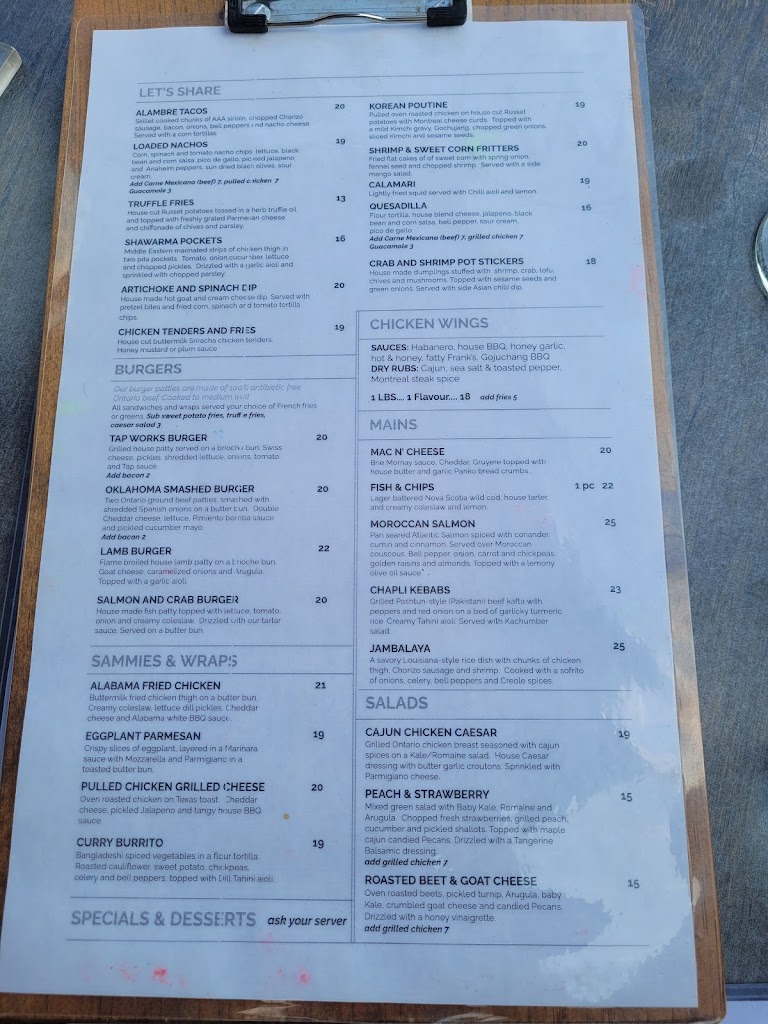 Phenomenal food and customer service! Mine and my familys go-to place! We ordered the Tap Works Burger and the Salmon/Crab Burger - both 10/10. I had the Salmon/Crab Burger and I can honestly say that it was one of the best burgers I have ever had. Truly. Moreover, as I was waiting at the restaurant for my order, I received excellent customer service. Thank you Tap Works! :)