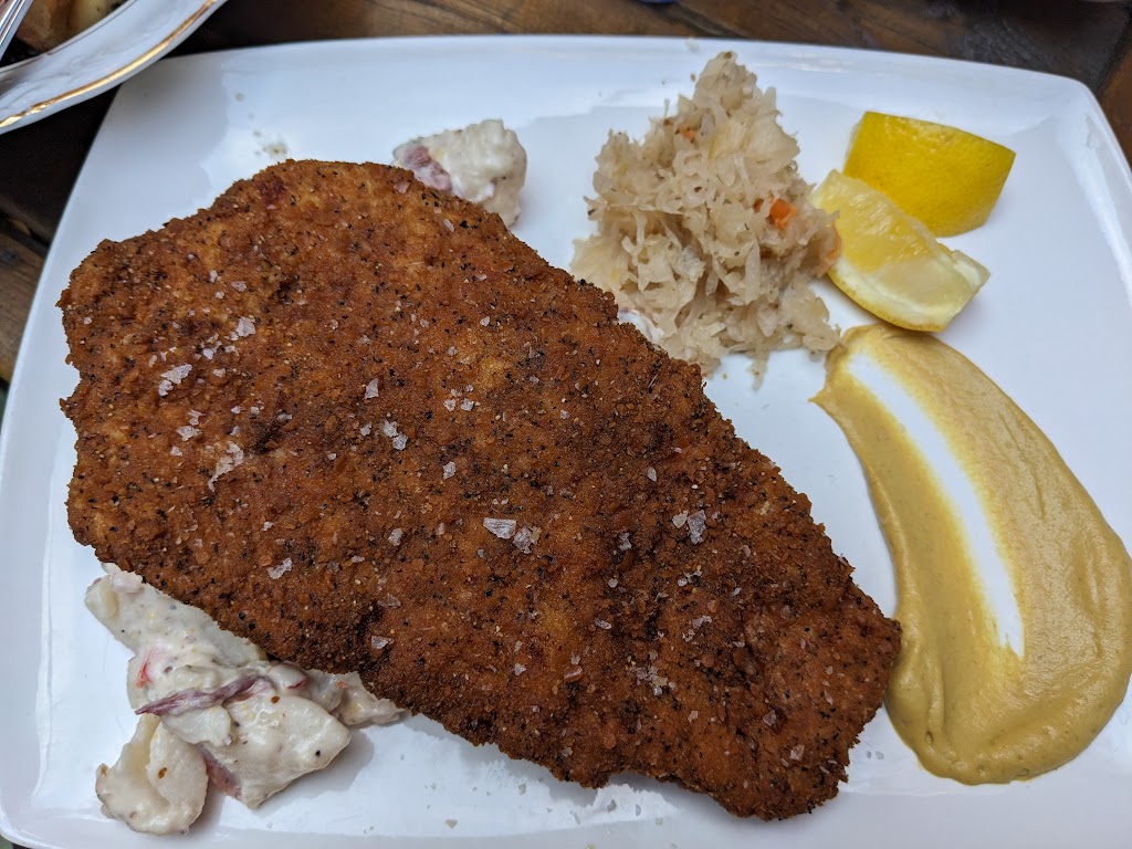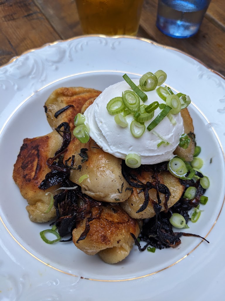 I love this place! The food is so, so good. The service is fast and friendly. And there's lots of space to accommodate groups. Nice patio too. I've tried the chicken and pork schnitzel and both are delicious, but I thought the pork was tastier. The potato salad it comes with is pretty good. The pierogies are incredibly tasty, served with the best onions and thickest sour cream. I didn't get a pic but a friend got the beef cheek and it was incredible! The sauce was super buttery and rich, as was the meat. The spätzle served with it was tender but nice and crisp on the exterior. Will probably become a regular spot for us. PS apparently they have ski-ball too?!