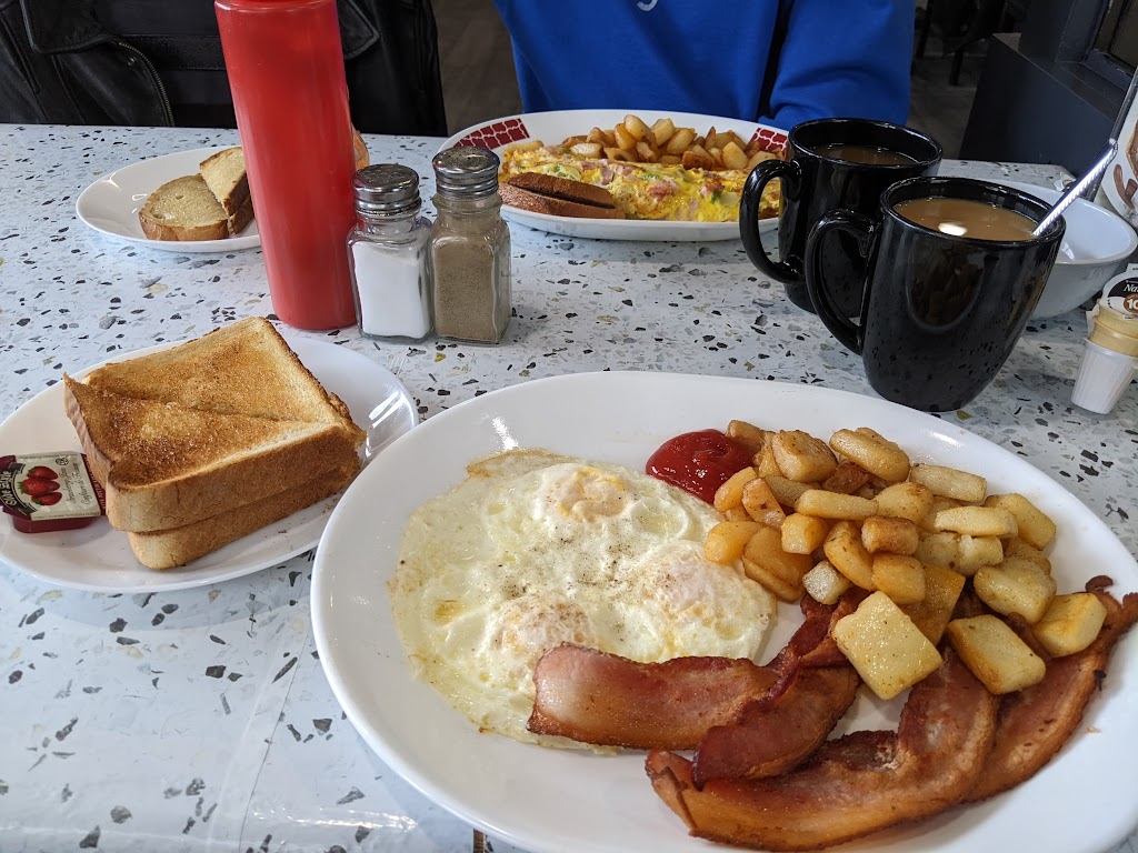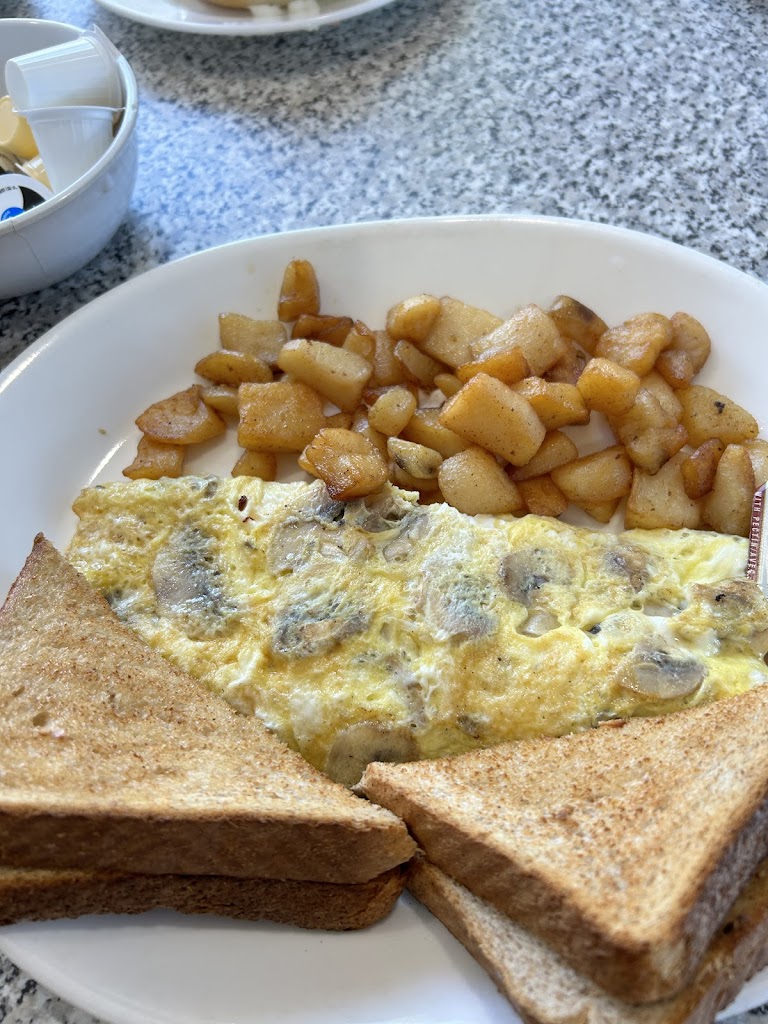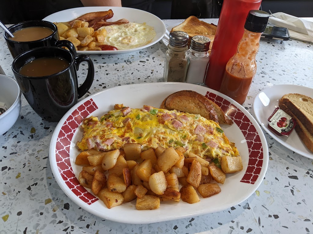 Stopped in to have breakfast. We ordered 2 kinds of omelets. Both were good and came with home fries and toast. Coffee was good and they have free refills.