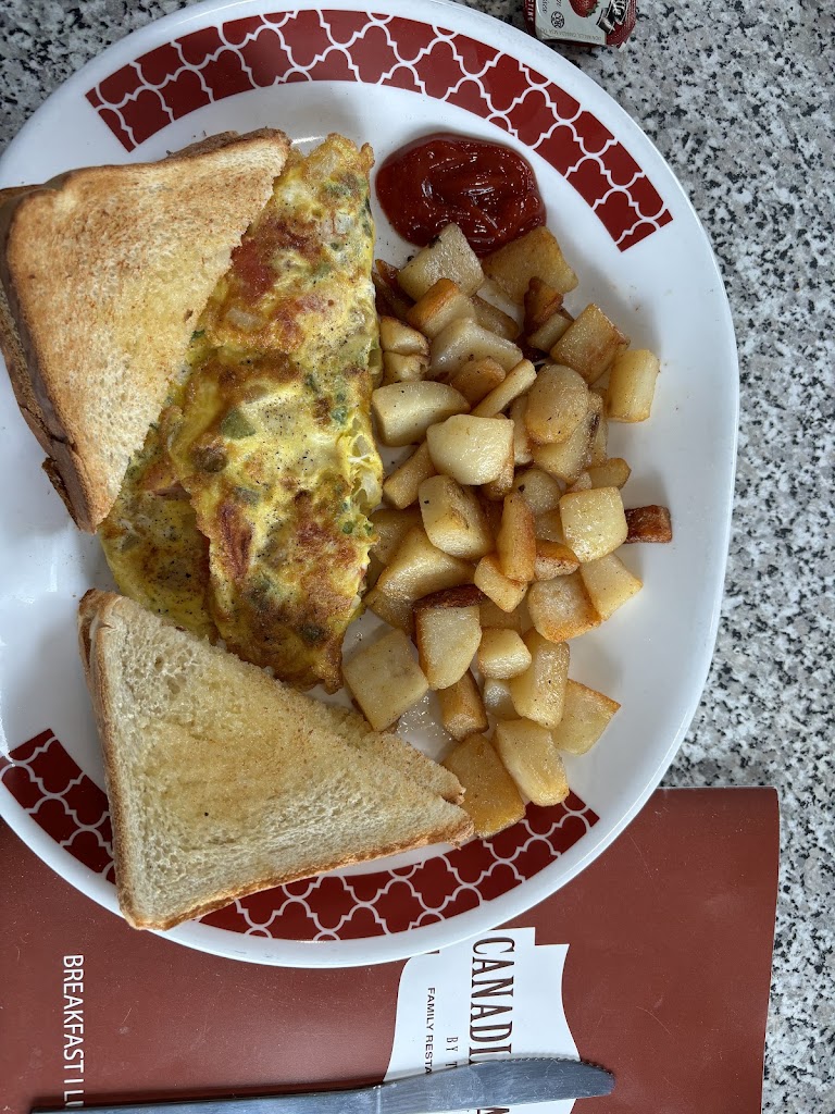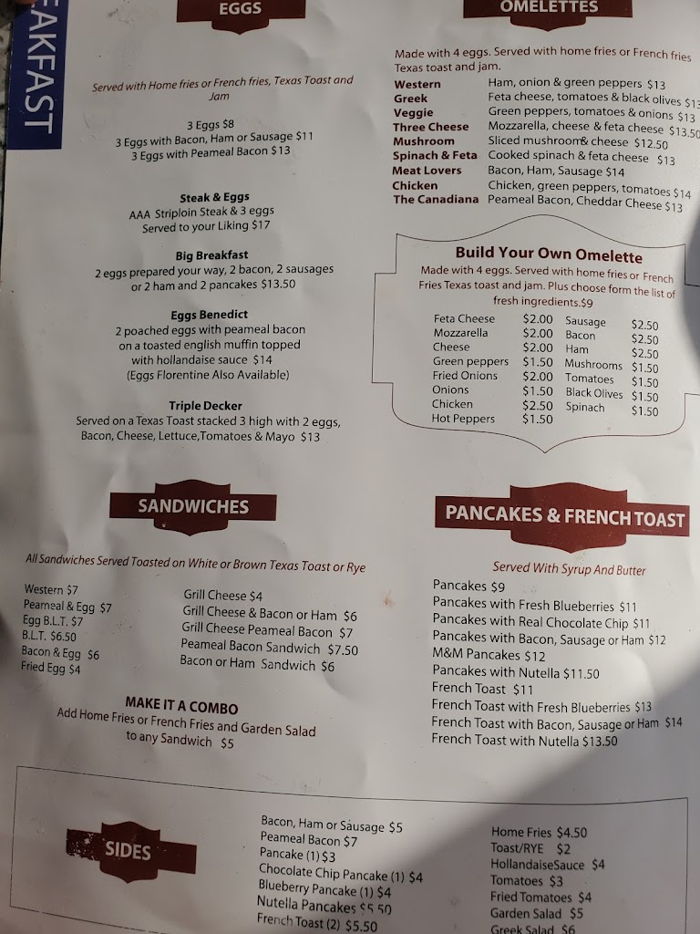 Canadiana Grill by the Lake serves a delicious breakfast and dinner menu at an affordable price. Atmosphere: The staff and owners are friendly and courteous. We go there for brunch on weekends and sure it's busy but the service is efficient... Food: 10/10 on the large portioned western omelette. The eggs were perfect and the bacon was crispy. 😋 Home fries are decent and plentiful. Their coffee is a good blend, not too strong and bottomless.☕ Cheesecake Factory desserts are available at a fair price.💙 We would highly recommend this family restaurant for any meal from lunch to dinner in a clean, relaxed & friendly atmosphere. 👍🏼