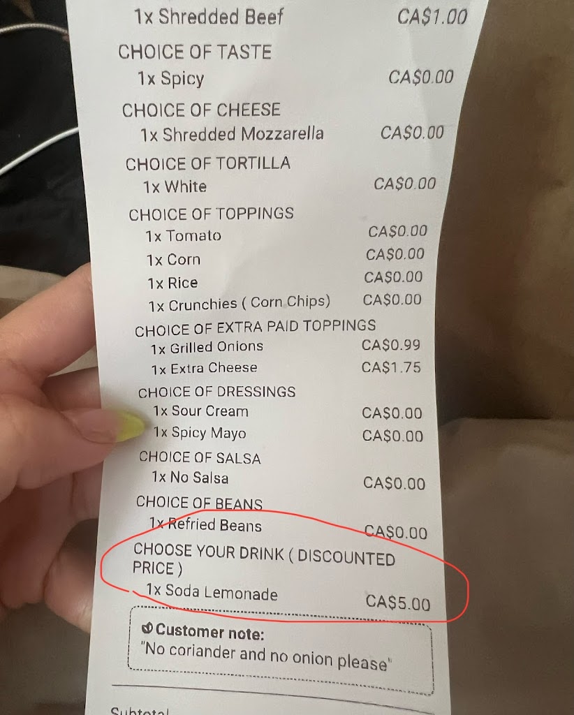 Not all my requested customization and toppings were added. I ordered ground beef burrito and fish burrito but what I got was like rice burrito with droplets of protein Barely any fish and meet in both wraps. That was so damn disappointing and On top of that the wraps were very small.