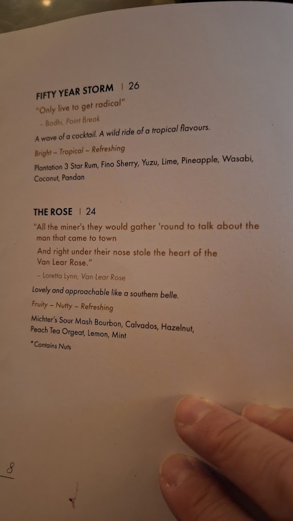 Amazing cocktails, and lovely staff. I asked for something not on the menu and they tried creating it for me but short on one ingredient. Honest and were able to explain they were not able to make it half way through in balancing the cocktail. Loved it! Definitely recommend for amazing cocktail experience..