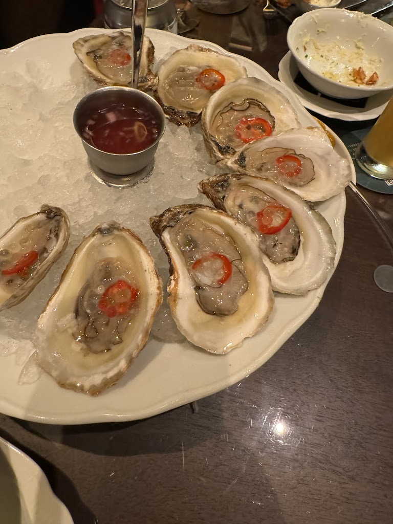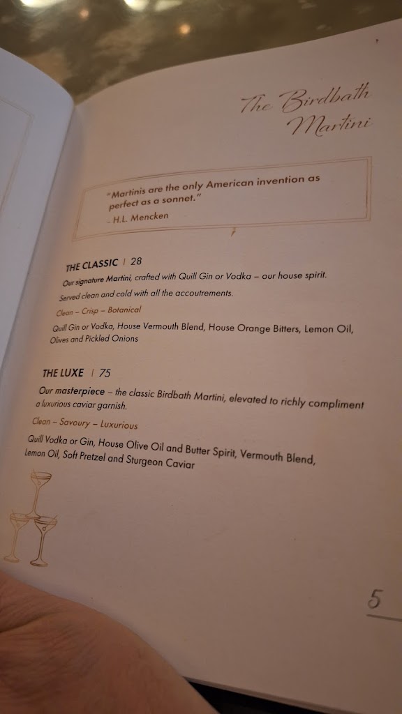 Invited for cocktails, we were quickly seated and provided menus. Birdbath Martinis with the accompanying mixed olives arrived quickly and did not disappoint nor the show like way they are served by clean, well dressed Staff who know what they are doing. The 1/2 dozen oysters as a side dish were disappointing in size and with nothing more than a sprig of over powering cilantro to go with it. A shame.