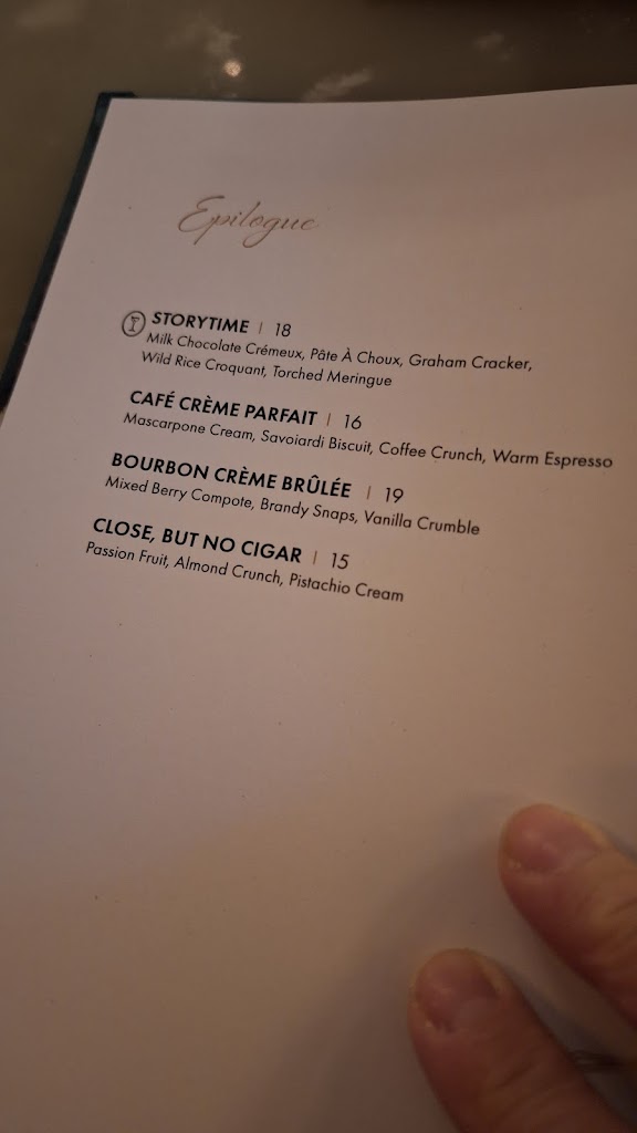 Great atmosphere. The team here are all very attentive. Drinks and dessert (Close, but no cigar and Creme Brulee) were amazing. Our bartender (Meiko) was just amazing.