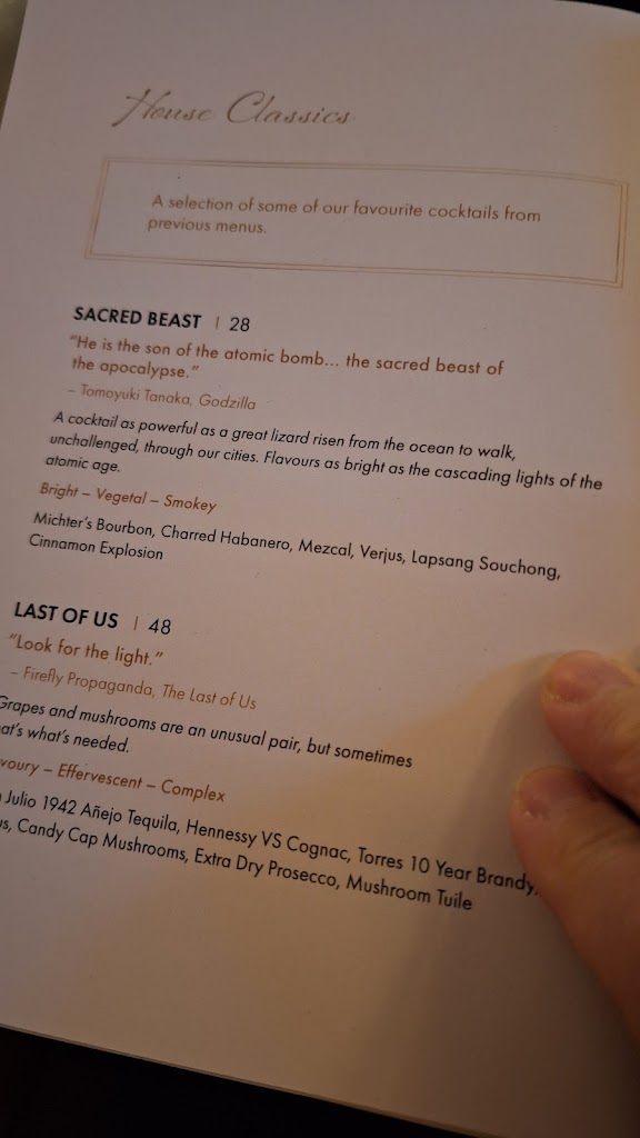 Nov2024 Definitely deserves its place as one of the most wonderful bars in Toronto The cocktail menu is heavily curated, well researched and creatively presented. The printed menu is a joy to peruse and enlisits a fun conversation with your server, who is equal, if not exemplary train to the task, of being knowledgeable and helpful and very attending. Desserts are culinary masterpieces and blends well with the drinks in both palete and concept. The atmosphere is relaxing, cozy, and condusive to a relaxed pace. Truly a gem and a must go to destination for visitors. Reservations are a MUST