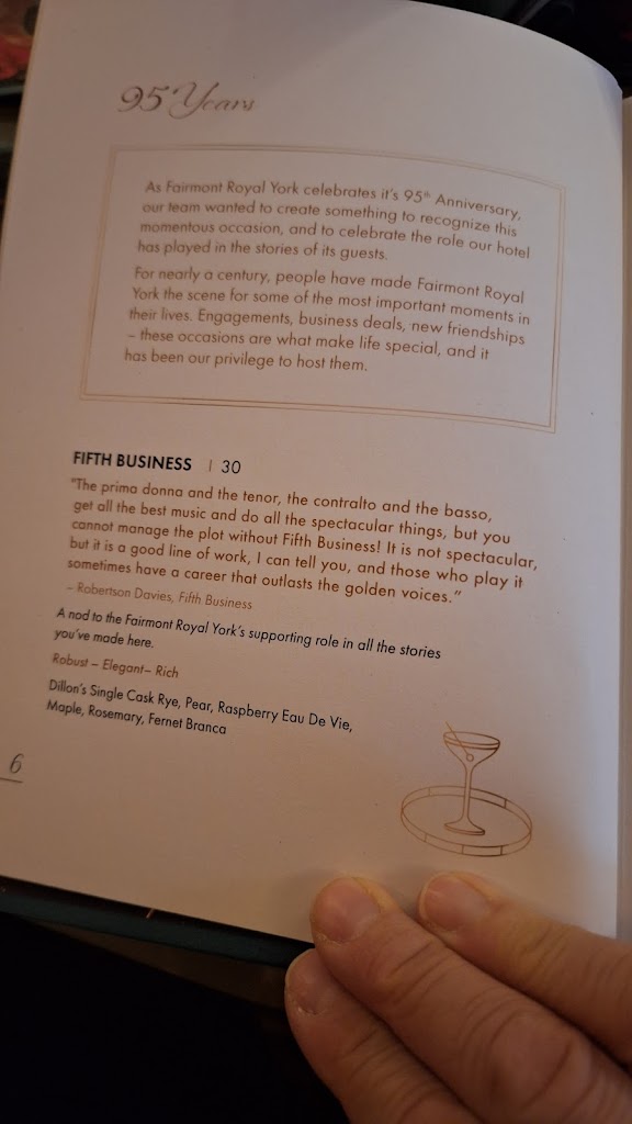 From the moment arriving having cost check, fantastic seat the bar to watch the drink being made and being served in a timely matter. Ended up stopping by twice for a couple drinks each night of my staff at the Fairmont Royal York. Cheers.