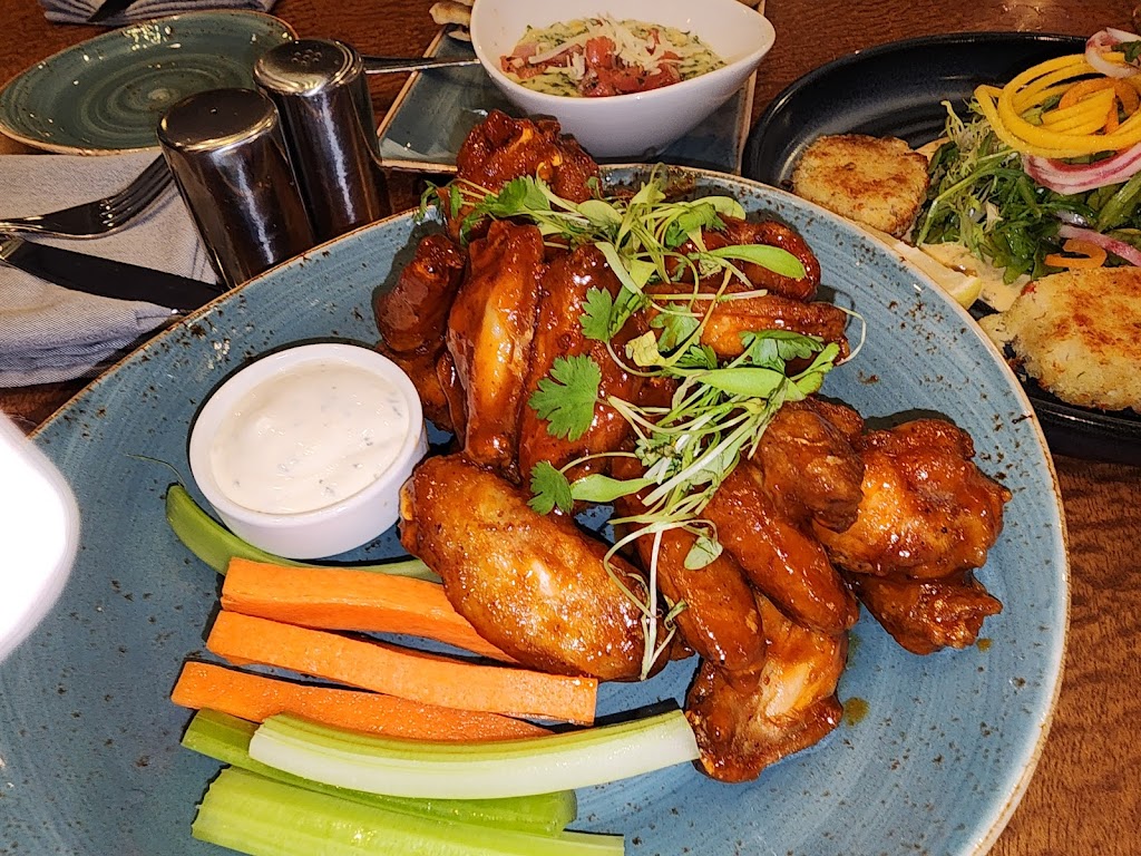 Chiken wings, burger, apple martini and draft beer. All was great! The service was fantastic. Cheers enjoy Food