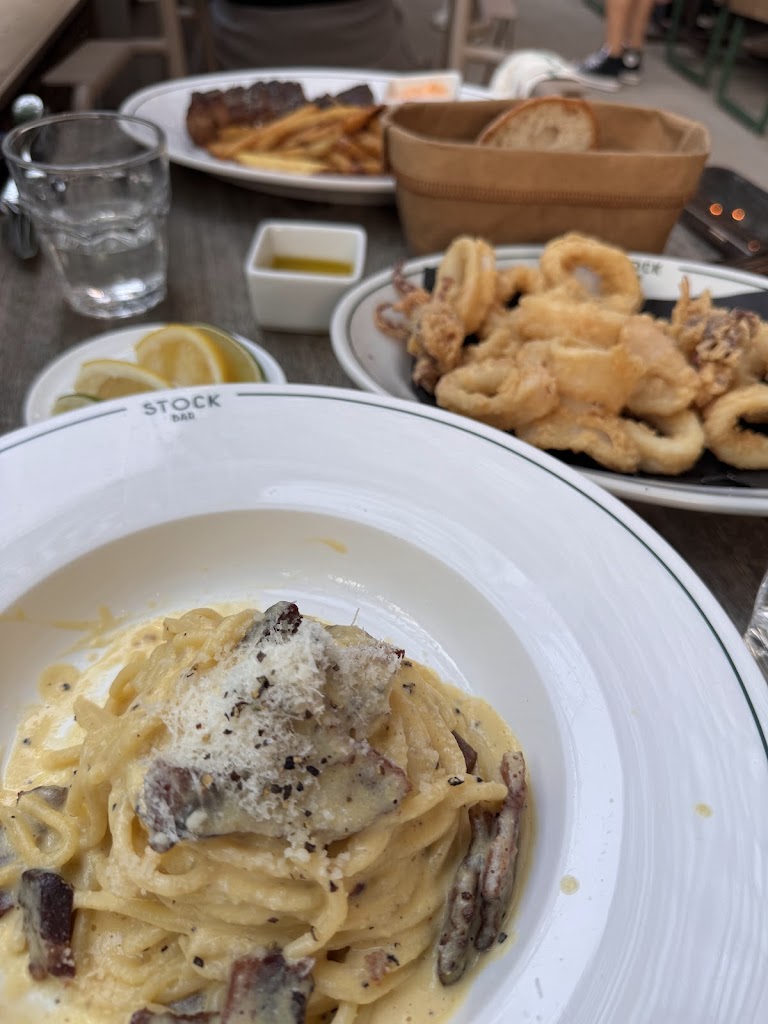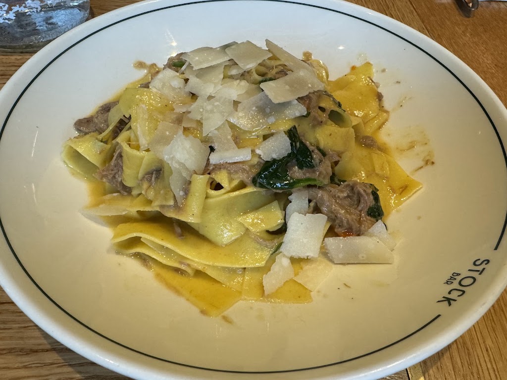 Came to STOCK s rooftop patio for dinner, and overall the food and service were good. We ordered the burrata, tagliatelle alla bolognese, and a pizza. It was mostly average for the price point, and we wished the pizza had more toppings.