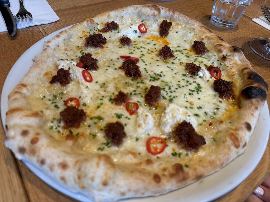 The service was grudging and the pizza and carbonara were well composed but a bit too salty. The zucchini flowers, funghi salad and seared steak tartar were exceptional.