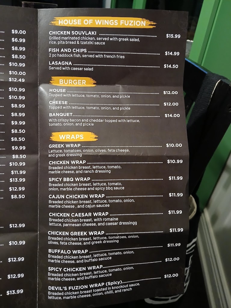 This is a brand new place with delicious wings and good prices! I went with a couple of my buddies who also enjoyed it. I had at least 3 pounds of wings (honey hot), shared a big fries and onion rings, and had a pop. My bill came to $50. The price is great, considering most places charge $18 per pound of wings - whereas this restaurant charges $13 for 1 pound!