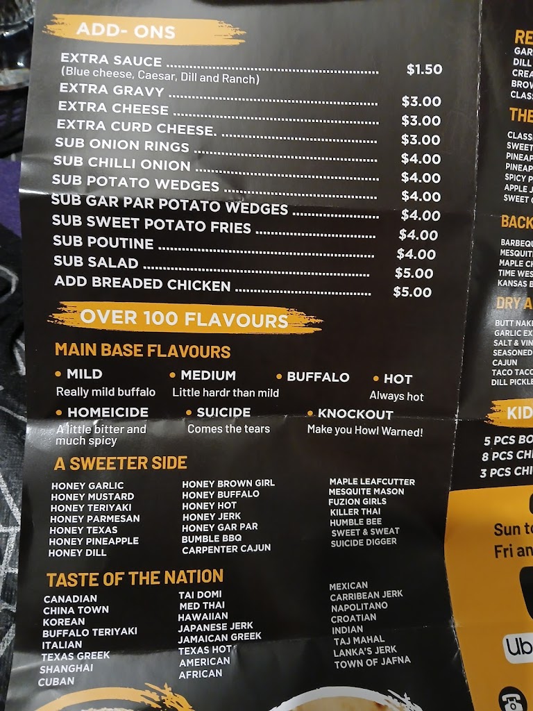 Welcome to the Neighbourhood! We've walked by a few times, and decided today would be a good time to try them out. We were not disappointed! What a fantastic menu! We tried out three flavours to test them, and the flavours were tangy, the wings were meaty, and we we can't wait to come back and try more of their flavours! (There’s over 100 flavours!)