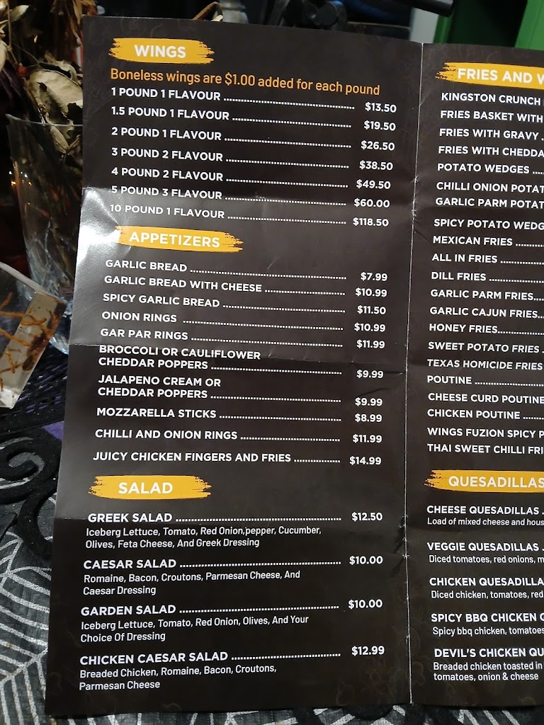 Everyone is welcoming. The food flavours are amazing. I had wings and poutine. The portion size made my eyes drop. Quick service and everyone was laughing and enjoying themselves. Can t wait to go back and sample the menu. Hamburgers, fish and chips, wings 101 flavours , salads , wraps and more