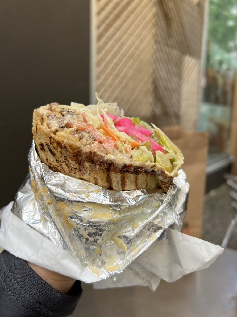 True hidden gem. Behind the hasty market, lies a bumping shawarma restaurant that is making super authentic Saj bread on a large hot stone. This isn t your typical shawarma with pita bread. This is thin but chewy, then placed into the press to get crispy. Truly the best vessel to hold all the toppings. Only 2 options for shawarma, chicken or falafel. I went with chicken, and got everything on it, with hot sauce, garlic sauce, and tahini. No hummus option. They slice it into 2 and wrap them individually, because they know how large they are and how likely it will be that you save half for lunch tomorrow. Cost is more expensive than your normal spot, but it s worth it. Will be back and will continue to recommend this spot. Cheers.