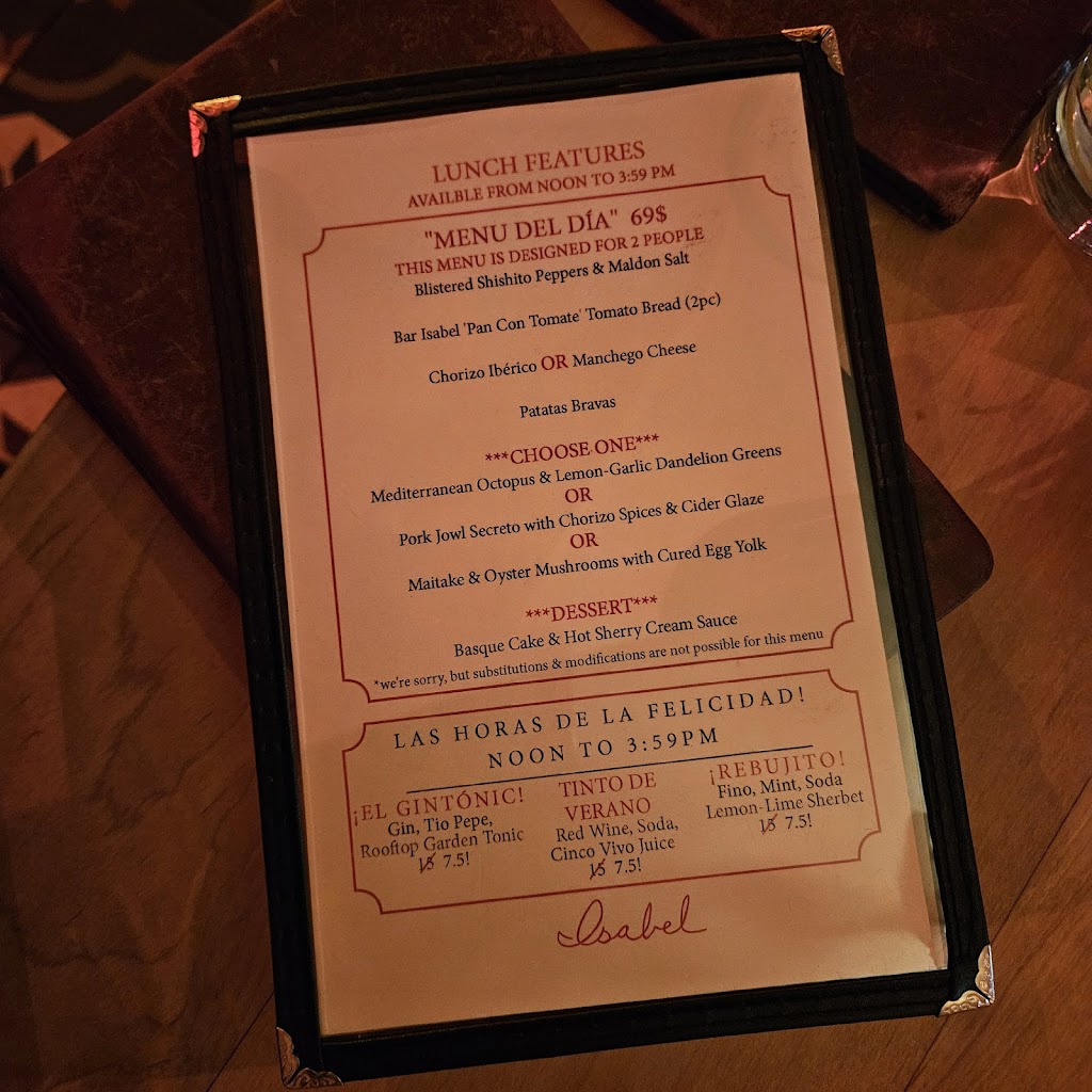 Bar Isabel is a must-visit for anyone craving Spanish tapas in a relaxed, old-world tavern setting. After much anticipation, I had the pleasure of trying their Saturday Lunch Special, and it was an absolute treat. This $69 prix-fixe menu, available from 12 pm to 4 pm, features six dishes to share between two people, alongside half-priced cocktails. While it wasn't too busy when I arrived Saturday at 1 pm, reservations are generally recommended. The tapas-styled dishes were diverse and delicious, with each bite offering something unique. Made with high-quality ingredients, and everything we tried had a good balance of flavours and textures. The service was exceptional from start to finish. Upon arrival, I was greeted with a warm welcome and seated promptly. Our server was friendly, attentive, and always ensured that our water glasses were never empty. Overall, Bar Isabel lives up to its reputation for fantastic food and outstanding service. The Saturday Lunch Special is a fantastic way to enjoy a variety of dishes while keeping the experience affordable. I'm already looking forward to my next visit!