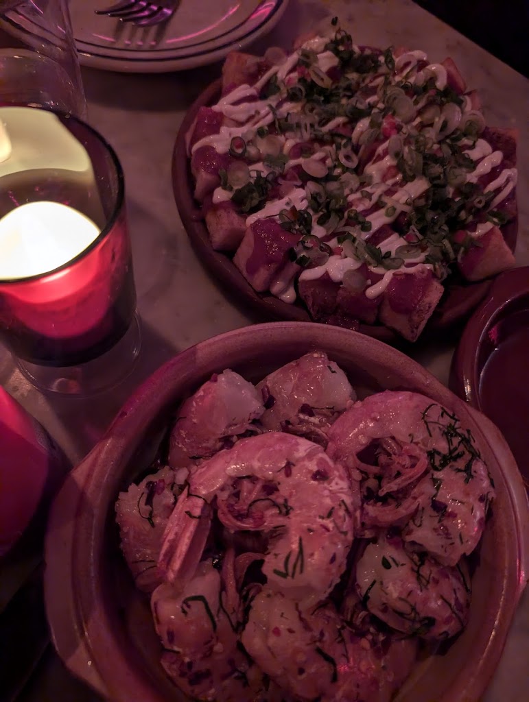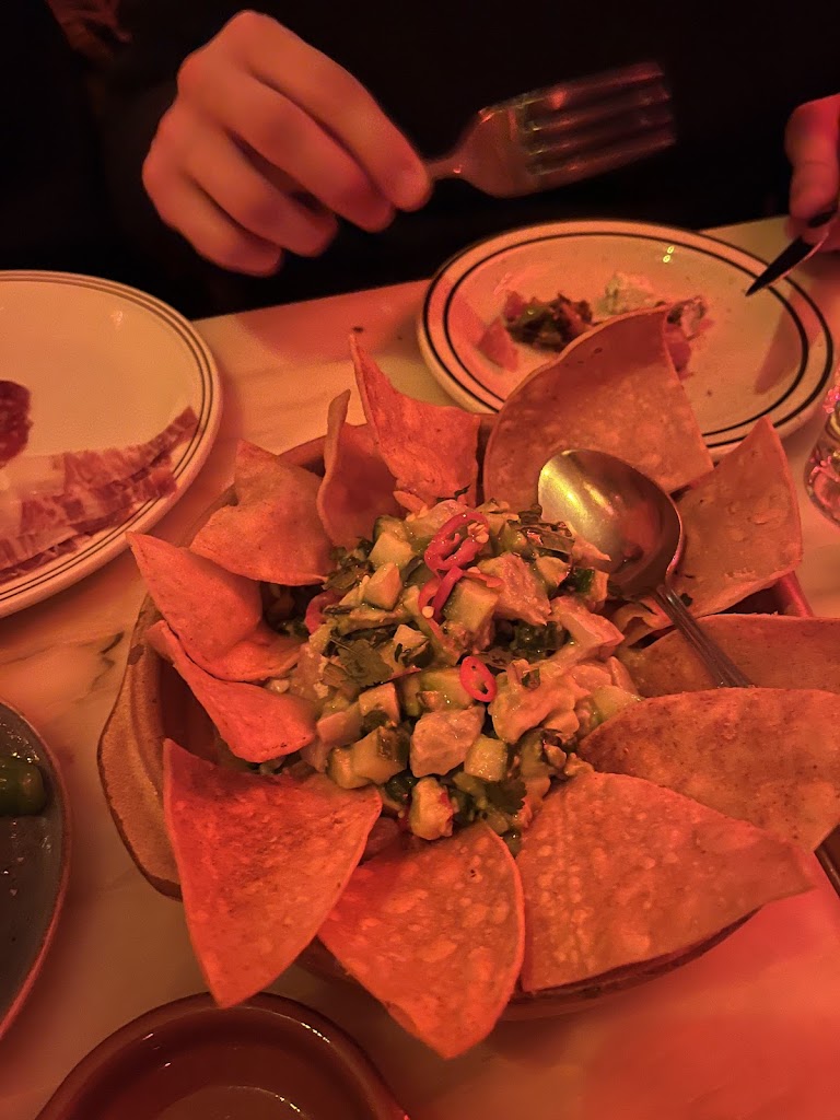 We had an amazing time at this bustling Spanish bar/restaurant! For food, we tried the ceviche and chips and the pork secreto. The pork was definitely the highlight of the night, especially the delicious sweet dipping sauce that came with it! My friend and I also tried the rebujito and the rambla highball which were both nice cocktails. Service was really nice and helpful. The food and drinks also came out decently fast despite the restaurant being super packed and busy. The restaurant atmosphere is great (dimly lit with red lights), however it was pretty loud and difficult to hear.