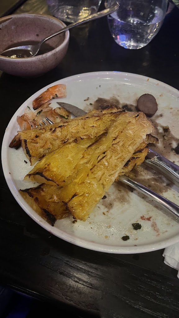 Overall, we had a pleasant experience at this restaurant. The ambiance was cozy, and the staff were polite and attentive. The music volume was just right, creating a nice atmosphere. We visited on a Friday night to enjoy the live dance performances. Every 45 minutes, two dancers would perform for 3 to 5 minutes, but for most of the time, they weren’t on stage. Although we were initially told our table was reserved for two hours, we stayed for almost three hours. In the first two hours, we ate and were full, but in the last hour, we mostly enjoyed our dessert, the ambiance, and the music, declining the additional food offered to us. In terms of the food, there were some issues. The meats were brought to the table with delays, and one of our guests who requested a well-done steak had to wait a long time to receive it. The variety of meats was decent, offering around four to five types, along with shrimp, salmon, and grilled pineapple. However, the frequency of meat servings was inconsistent. Sometimes we were left waiting for a long time between servings, and with seven people at our table, there were times when only five would receive their servings, leaving the other two waiting for the next round. This was less than ideal considering the price point. Additionally, the meat was a bit too salty, even for one of our guests who usually enjoys saltier food. As for the drinks, we had wine, cocktails, and soda. The drinks were fine, and soda refills were available. In the end, with tax and service charges, our total came to about $125 per person.