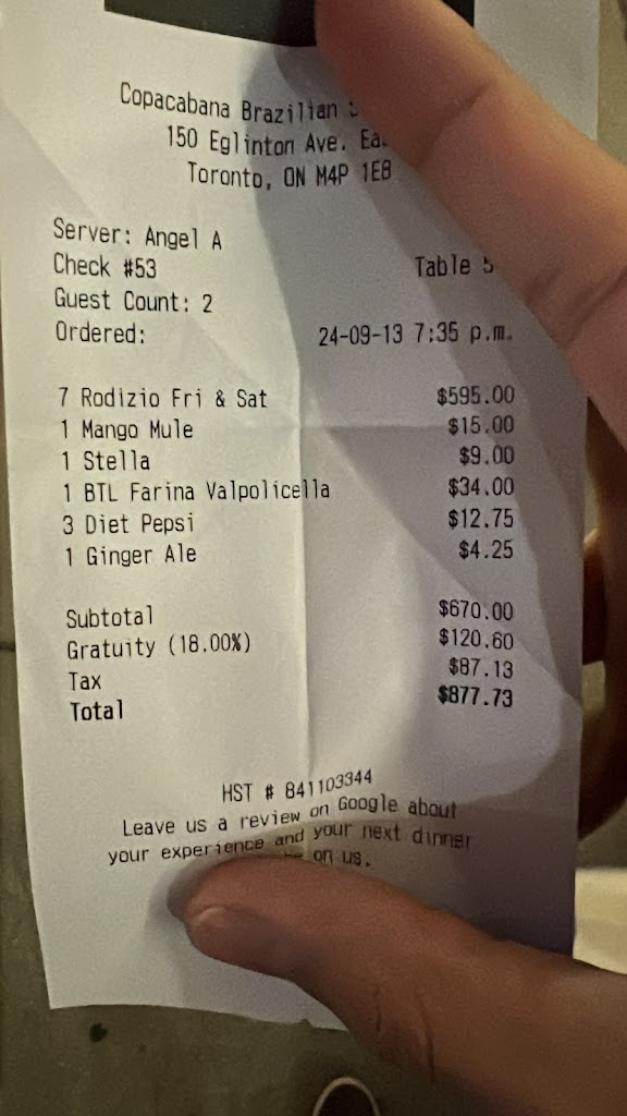 A Disastrous Experience at Copa Cabana I just had the worst time at this Brazilian steakhouse in downtown Toronto. The food quality? Sure, it was good, but the amount they give you is a joke! For an all-you-can-eat place, I thought I would get plenty of meat, but there were only three or four meat/steak options, and they barely served any. It truly feels like a scam! They want you to fill up on the side dishes, but they don t provide a proper main steak dish to go with them. As a result, you end up getting full on sides that are often solo who wants to eat mushrooms on their own? Seriously! The service was excruciatingly slow! One server came to our table and said he didn t have enough meat for everyone, serving only three out of the four guests at the table. He promised to come back, but guess what? He never did! And most of the dishes are guess what? Not steak. From pineapple, to chicken, to shrimps.. Leaving a steakhouse without tasting steak? That s beyond frustrating! And don t even get me started on the 18% gratuity they add automatically. It s ridiculous for such awful service. They also push their expensive drinks hard. I said I didn t want a second drink, but the server was really insistent, trying to serve me almost immediately. Get you drunk, get you full on sides, but don t get you any meat. Wow! The atmosphere is lively, but it doesn t make up for the complete lack of meat you expect at a real steakhouse. For the prices they charge, you should get a proper experience, not this disaster. Avoid this place unless you want to leave feeling utterly deprived, outrageously dissatisfied, and seething with hunger and anger!