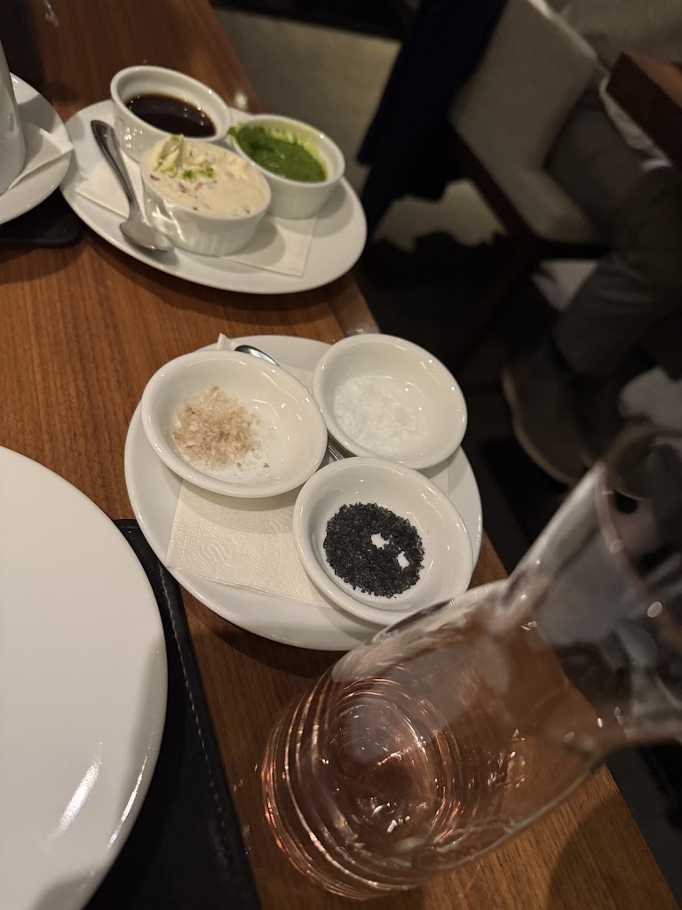 The steaks were great ! We ordered 3 different steaks and each steak was distinct from the other which I loved. The bread was great. The potato gratin, salad ,Risotto and dessert was just average. The place is expensive, So I expected better ambience and furniture .Our table didnt even have the place mats, most tables did. That was bothering me all the time. Did they forget? The service was good though ,there were 3 servers attending to us.. but overall it was a good experience.