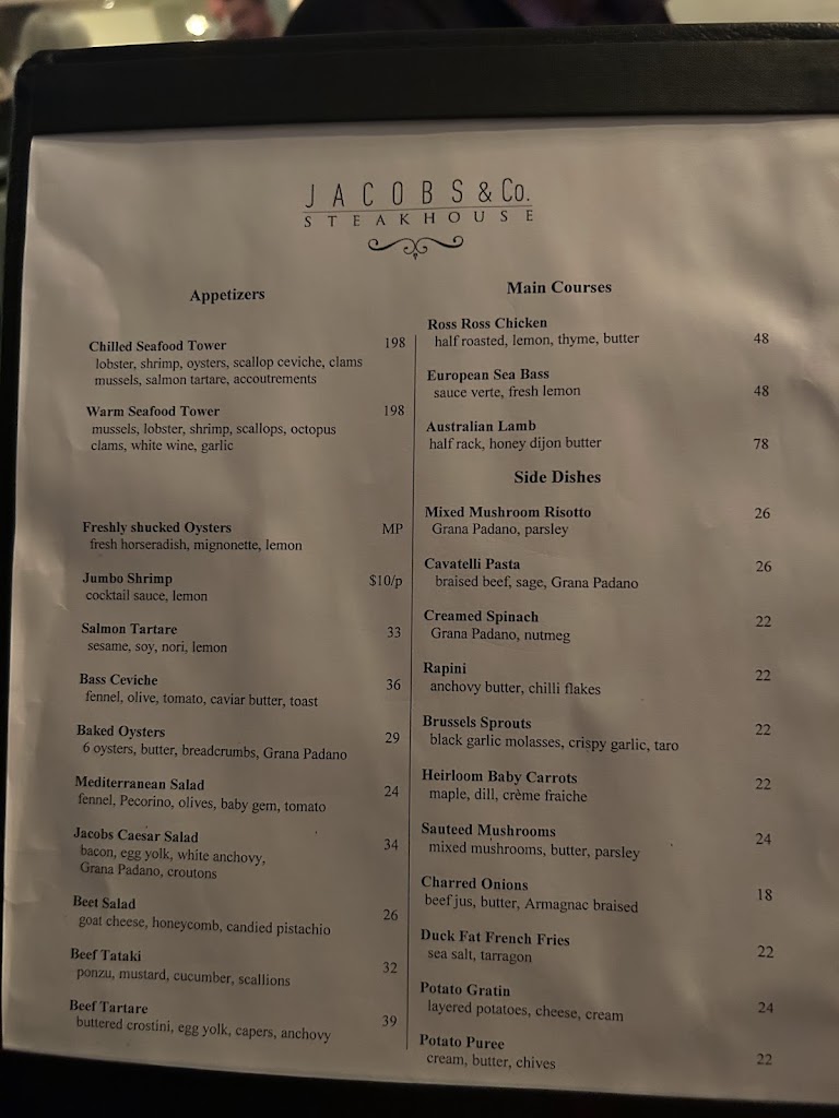I recently visited Jacobs and left feeling disappointed. Highlights: -Jacobs caesar salad was unique and delicious. -Our server took the time to explain the menu and gave great wine recommendations. Shortfalls: -Furniture/ambiance/layout/decor. The vibes are not that of a high end steakhouse. -At $500/person (app/main/side/wine) I would have expected better quality, taste, and texture. Steaks and sides were uninspiring.