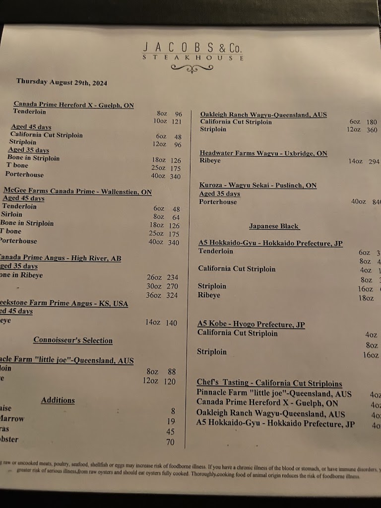 It was my first time here at Jacobs, had the 25 OZ T-bone, KS , a table side ceaser, duck fat fries, charred Onions and we had to try some Wagyu so we did 4 OZ mayazaki which was super decadent and just absolutely melted in your mouth. Went nice with a simple bottle of Chianti. We were celebrating an anniversary and Karan, our waiter, was not only extremely helpful with choosing some of the food, but made us feel like a priority in their very busy establishment. Would definitely return and probably will soon. Oh and if I may add, even though we did not have room for dessert, he still was able to surprise us with a couple small brownies which was perfect, followed by their famous take home muffins.