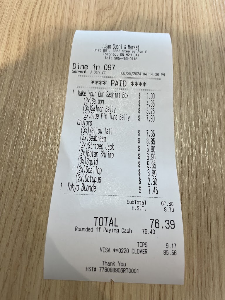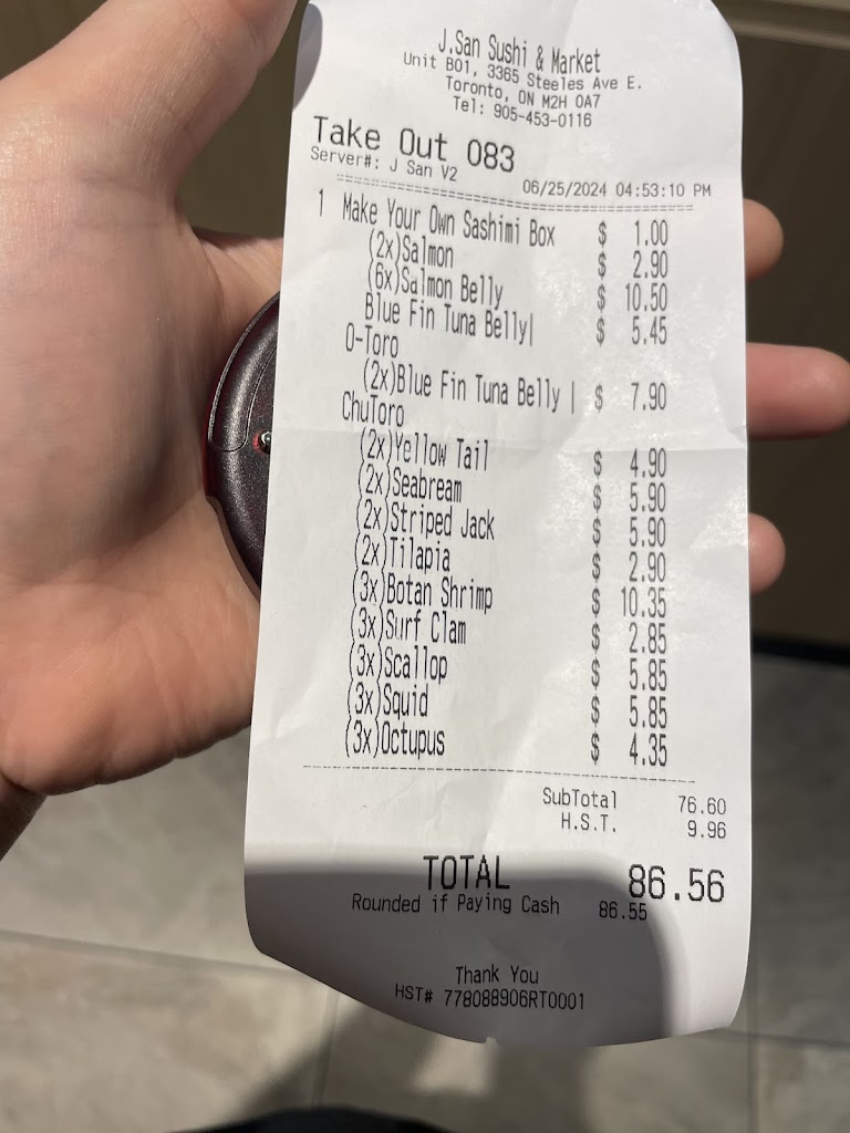I was looking for a new sushi place in Markham to try other than my usual Yin Sushi Market. My overall experience with J San was that it was very mediocre food for the price point. Some of my sashimi pieces were not that fresh and their customer service was seriously lacking!! I was hoping this could be a hidden gem, but it was a disappointing overall experience and will not be returning!