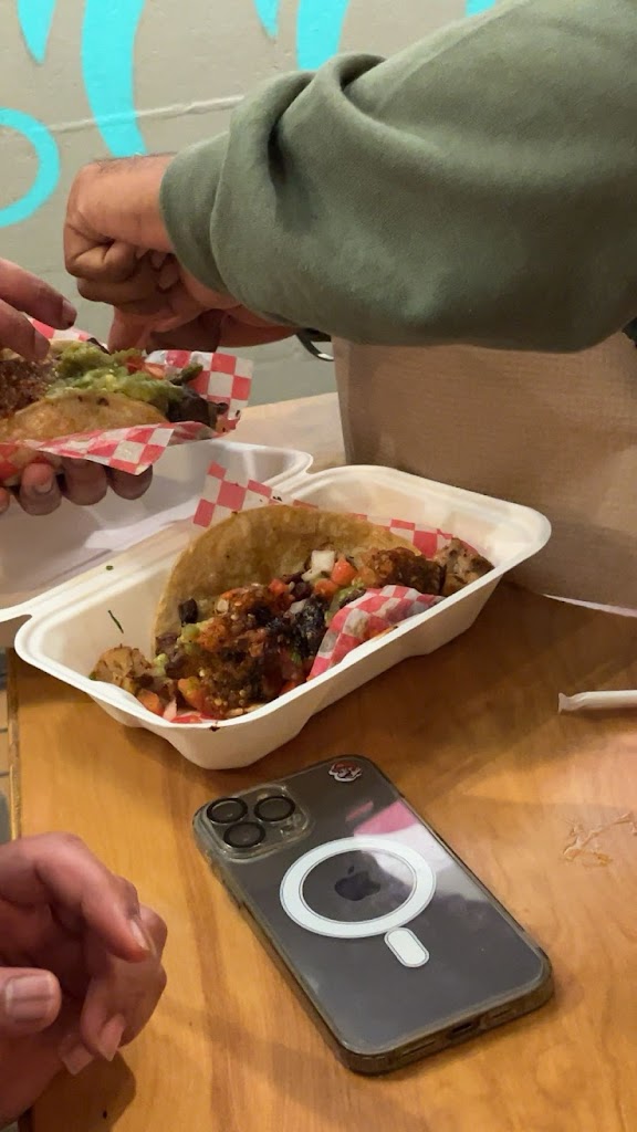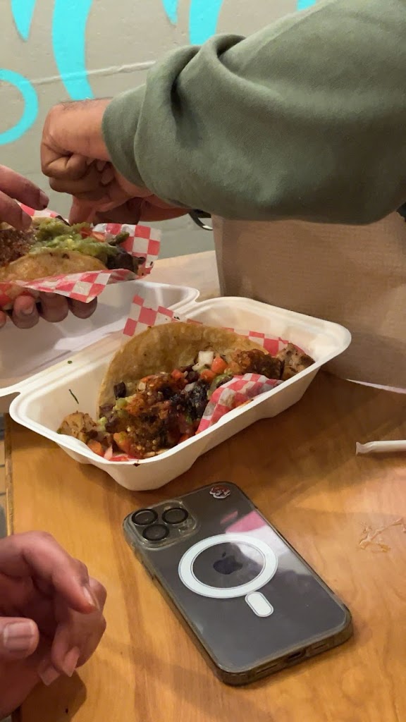 As a taco lover, I would give this place five stars. a girl at the counter was kind, and the overall vibe was so hippy. its one of the best tacos Ive ever had. two thumbs up. Its delicious, and I especially recommend the shrimp. You have to stand to eat, but its not a place to sit and chat, so I think theres a lot of rotation. There are always a lot of people. Highly recommended!