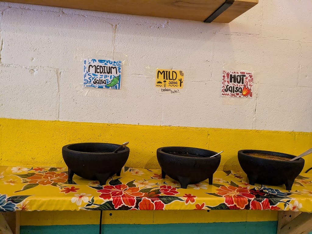 Buy the Baja fish taco for yourself or a friend, GF, BF, mom or dad, best friend, secert lover, and everyone you know who eats fish tacos. I added all the salsa flavours then went back to fill the gaps as I ate. The spice one has spicy flavour ** Parking: One way streets and slow driving. I recommend public tranist. A bus stops for walking along Spadina Ave.