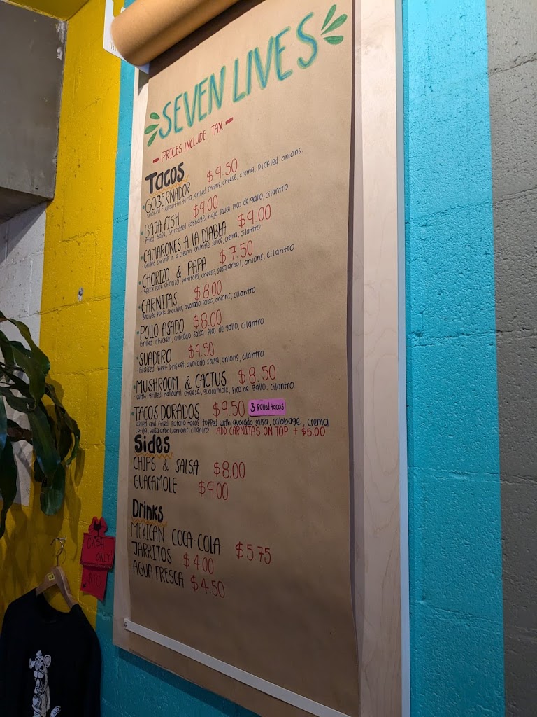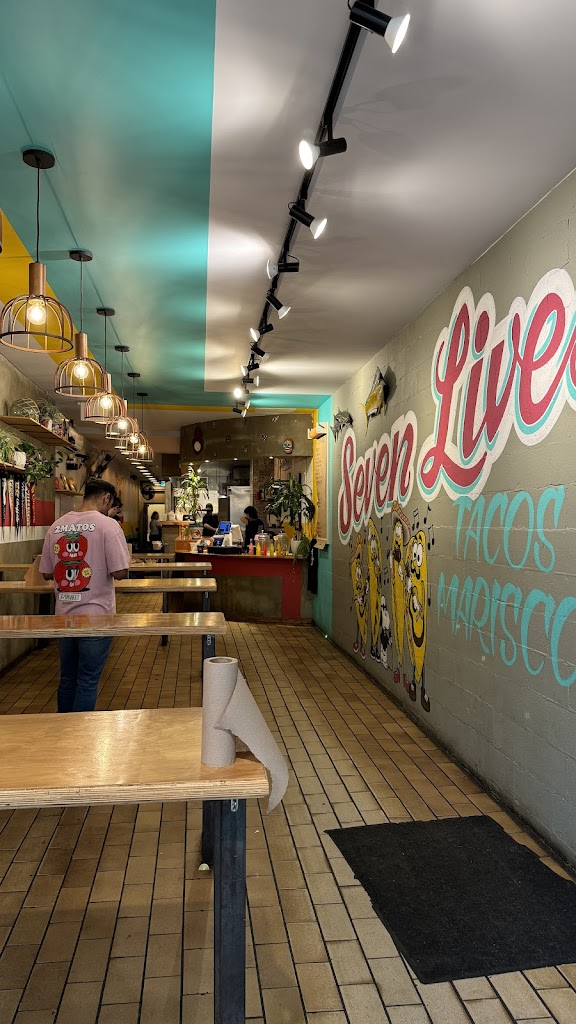 Seven Lives is easily one of the best taco places Ive ever been to. Im a big fan of fish and al pastor tacos and Seven Lives did not disappoint. The food came out quick and we ate while standing at one of the booths. There was complementary salsa near the register as well as wet wipes (a plus in my book). The fish taco was cooked to perfection, crunchy on the outside and soft on the inside. Paired with their tomato topping, this taco had the power to change my life. I followed up with an order of Al Pastor, which provided a more bold flavor profile to contrast with the airy fish taco. With the vibrant atmosphere and delicious tacos, you will be leaving wishing you had stayed and ordered another one. I highly recommend.
