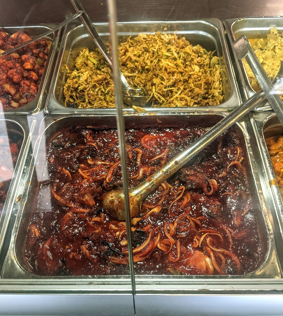 I only buy the vegan options from here. Kothu and Samosas. I think the food is yummy but the cleanliness is questionable. I still go but most recent time I went, it was worse. Perhaps they need renovation and air conditioning. It was hot and a lot of very sweaty employees.
