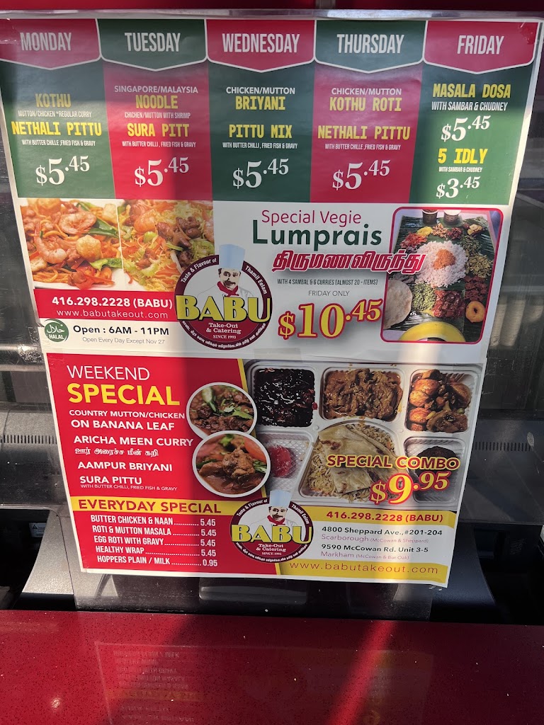 Babu take out is always my first choice of prefernce in scarborough for authentic cusines at less rates with heavy quantity. Im a huge fan of mutton kothu and fish soup. Moreover workers like Samsan Antony and their easiness in delivering foods fastly makes it top notch. I would surely recommend