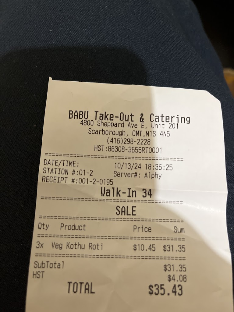 I wish I could give zero for customer service.. I went to Babu to take away dinner for my children.. I had worst experience the serving guys are so RUDE AND UNPROFESSIONAL.. they didnt pack food properly i took 2 kotu roti ONE meal ... kotu roti one was propley closed and another box wasnt closed properly my entire food was in bag when I called Scarborough location they said its not our problem u didnt handle ur food with care , i told him i travel by car not in ttc ..the person on call said he doesnt care what happens once food leaves. I WAS JUST COMPLAINING MY ISSUE AND THE GUY ON CALL SAID ITS UR PROBLEM HE PUT FULL BLAME IN ME HE WAS RUDE I asked the guys name he didnt say his name I asked manager he said he doesnt care and he hung up phone 3 times on my face SEE THE PIC UPLOADED .. I M DISAPPOINTED THE WAY GUYS WORK THERE VERY RUDE NO PROFESIONAL ATTITUDE I WISH THEY IMPROVE ON CUSTOMER SERVICE Another past incident they forgot to pack my rolls Another incident too much salt in food and didnt take responsibility I IGNORED ALL THE ABOVE I WOULD HAVE IGNORE THIS INCIDENT AS WELL BUT THE GUY HUNG UP ON ME 3 TIMES ... AND HE CLEARLY SAID I WILL KEEP HANGING UP ON YOU I WAS LIKE REALLY??? THIS IS UR ATTITUDE? ATLEAST SAY SORRY UR FOOD FELL NOT ASKING COMPENSATION WAS EXCEPTING A SIMPLE SORRY People serving food there have so much attitude Babu needs to make sure to hire good people