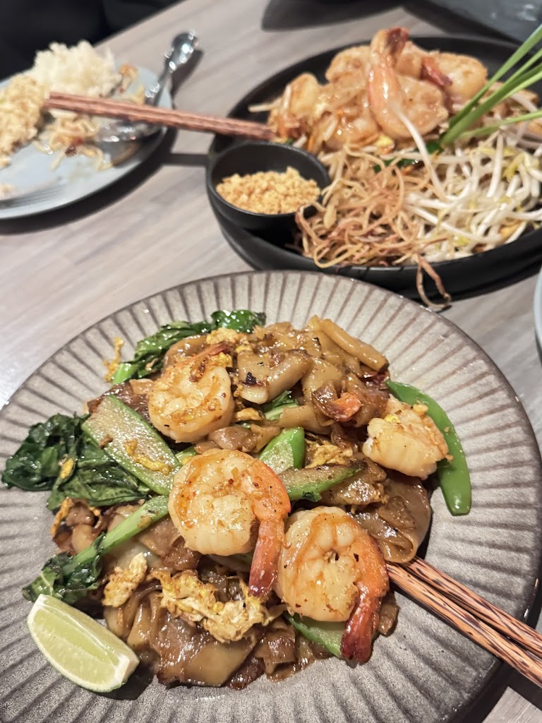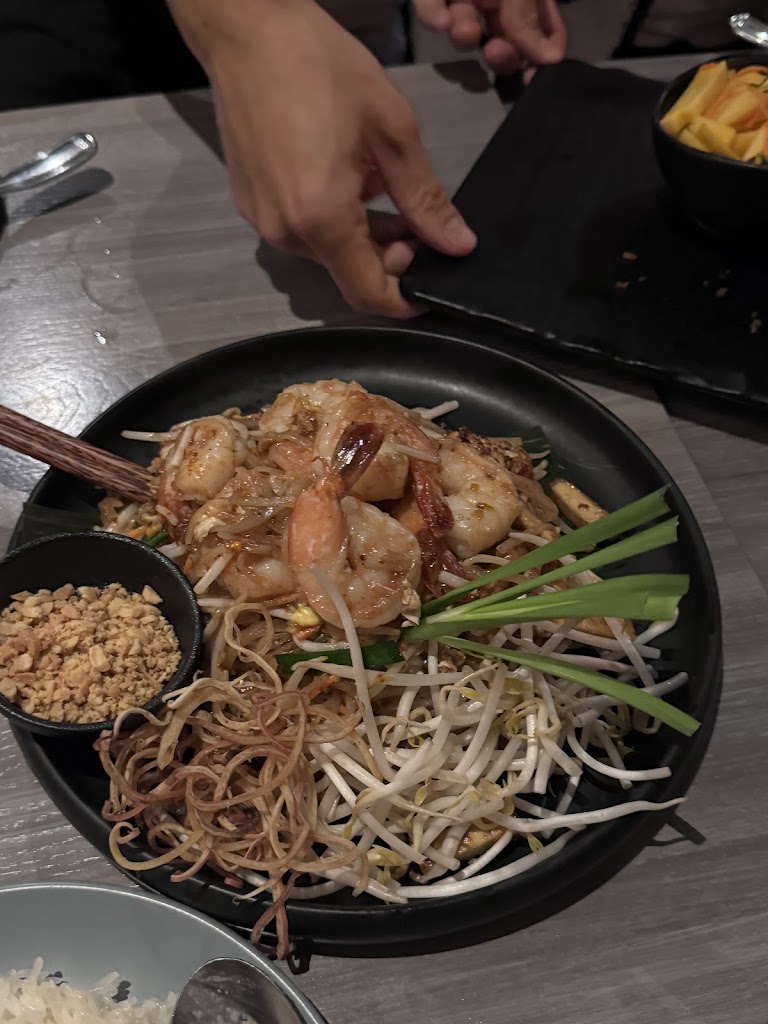 Delicious shrimp pad Thai and thai iced tea in a casual and spacious setting.