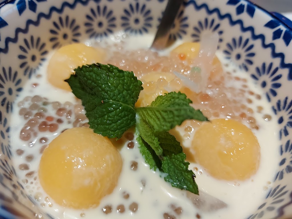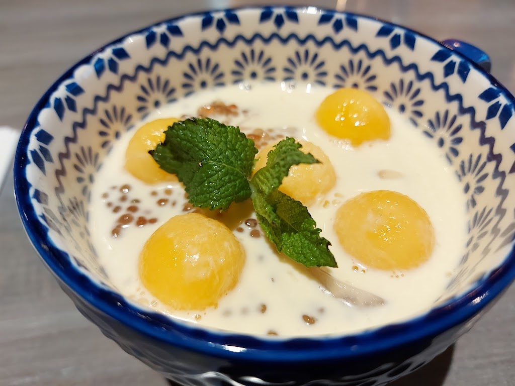 Although the tamarind flavor is barely noticeable, the "Beef Pad Thai" with bean sprouts, tofu, egg, oyster sauce, peanuts, chives and lime has a balanced salty, sweet and sour taste. Unfortunately, the beef slices are overcooked, tough, rubbery and hard to chew. The "Papaya Salad" with shredded green papaya, cherry tomatoes, chilies, long yard beans, shredded carrots, tamarind and peanuts is fresh, vibrant, crunchy and has a bold flavor profile. It is a perfect accompaniment for the Pad Thai. The "Cantaloupe Tapioca" is a warm, sweet and savoury dessert. The tapioca pearls, young coconut and cantaloupe balls provide three different textures. The coconut milk gives a rich and creamy texture. A great dessert for a cool autumn evening.