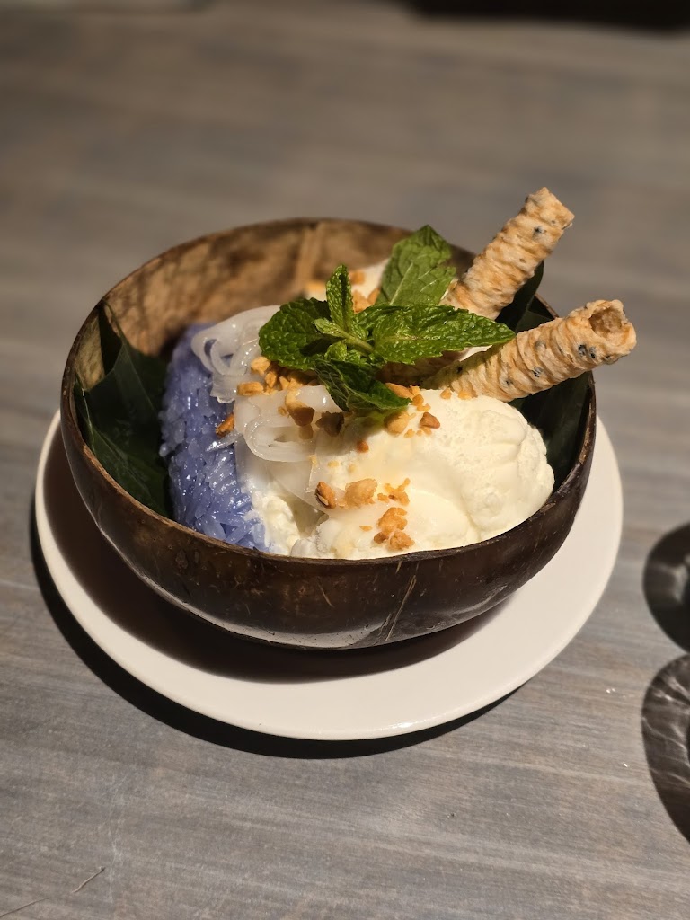 Really appreciate that they are super careful about providing vegan versions and are conscious of dietary restrictions. I had the vegan pad Thai with tofu, green curry and papaya salad. The green curry was my favourite of those options. The pad Thai lacked veggies and the papaya salad was soggy and not crisp. I also had the taro rice for dessert which was quite sweet and just not my type. Overall, the food wasn t bad but I was not blown away. Perhaps the fish sauce makes all the difference!