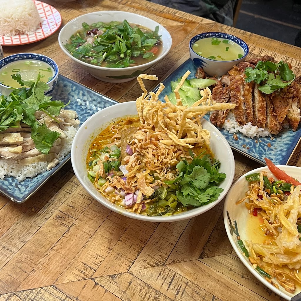 Delicious, authentic Thai food by Thai chefs. They have a simple menu with 3 items: Khao Soi (curry chicken with noodles), Hainanese Chicken on Rice and a daily chefs special. Excellent, well made, Khao Soi; it feels like Im in Chiang Mai. They offer Thai Iced tea as well! I am definitely addicted to this place!